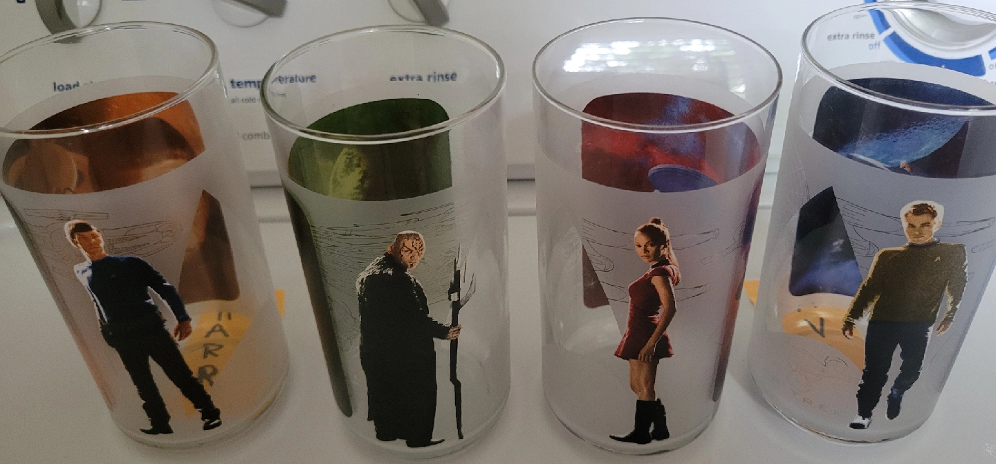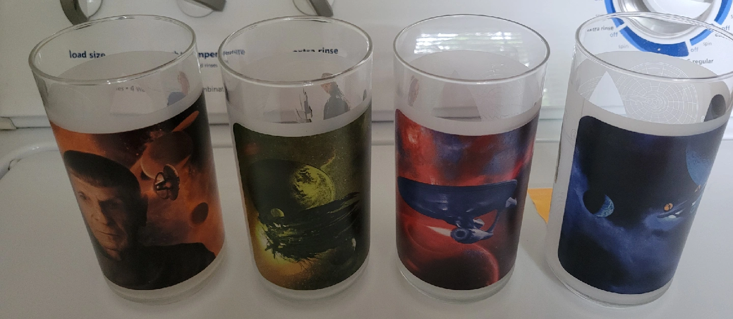 A beautiful set of 4 Star Trek glasses. No fading, chips or cracks. $30 for the set.