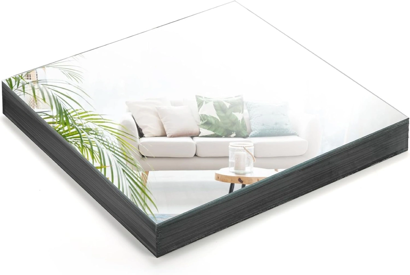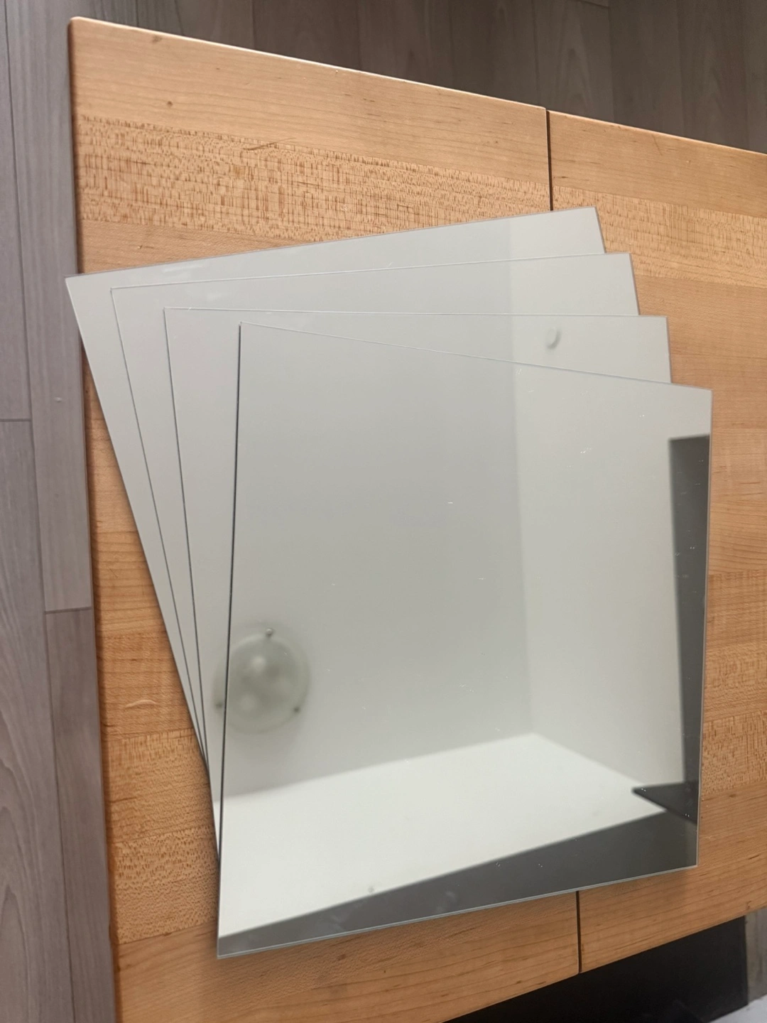 Four square mirror tiles. Can be used individually or as a set. Adhesive pads included. These are NIB and unused.