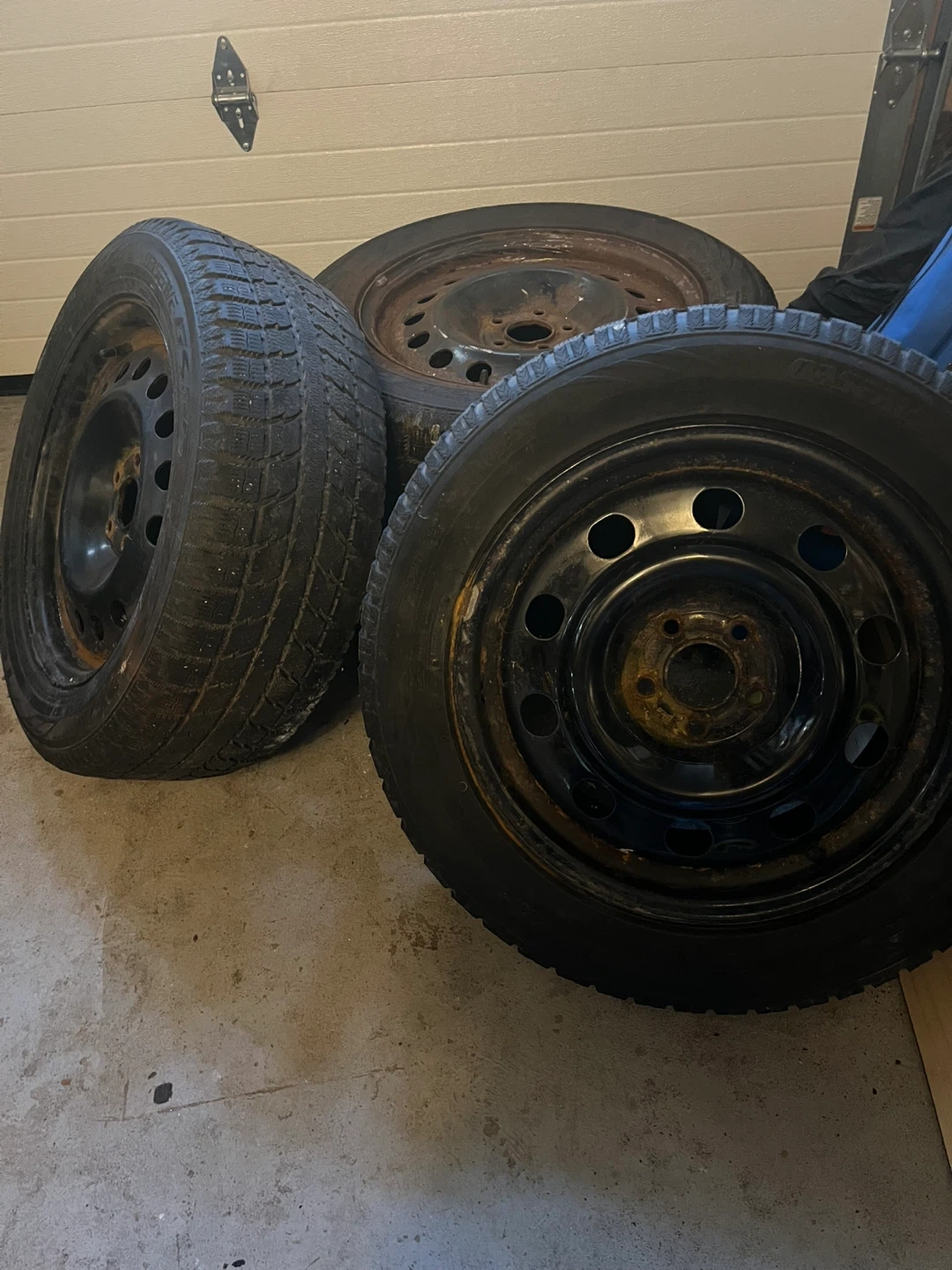 18Selling a set of four used tires mounted on steel rims. They show signs of wear and some rust, but still have some life left in them. Perfect condition