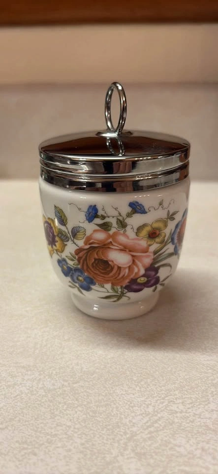 65Beautiful set of 4 vintage Royal Worcester porcelain jars with chrome lids. Three are marked Royal Worcester – Made in England, and one is unmarked but matches perfectly in style and size. All are unused — no chips, cracks, or stains. Light age wear only on the metal lids from storage. Detailed floral and bird artwork, classic English craftsmanship. Perfect for display, kitchen decor, or a collector’s shelf.