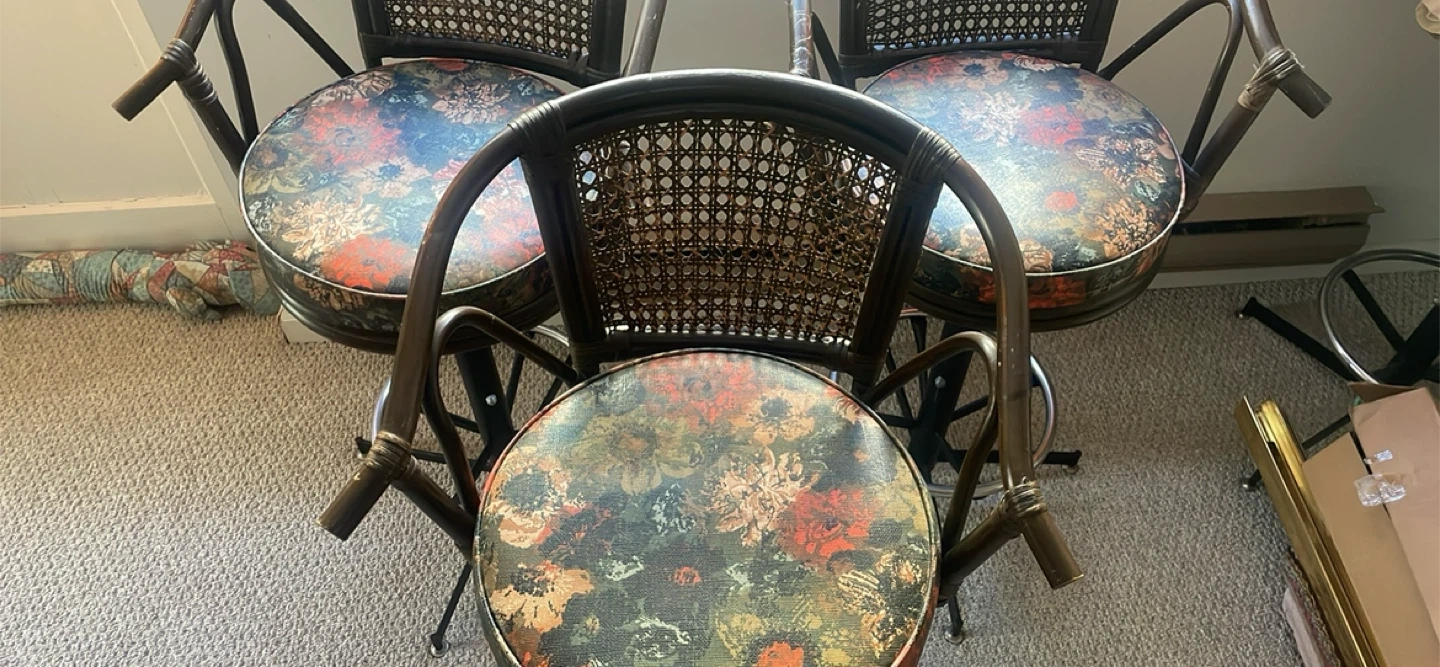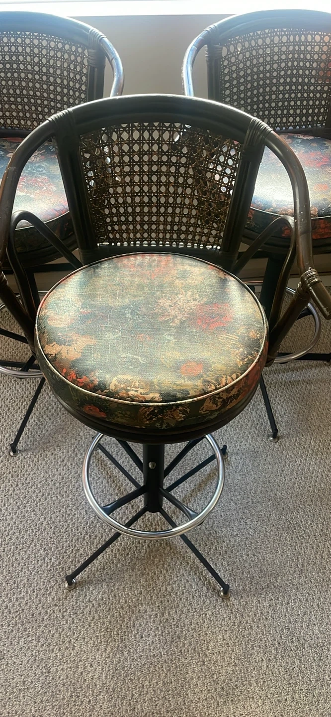 20Selling a set of three vintage swivel bar stools. They feature a unique floral pattern on the seats and a woven backrest. The frames are made of a dark brown material, giving them a classic look. Perfect for adding a touch of retro charm to your kitchen or bar area