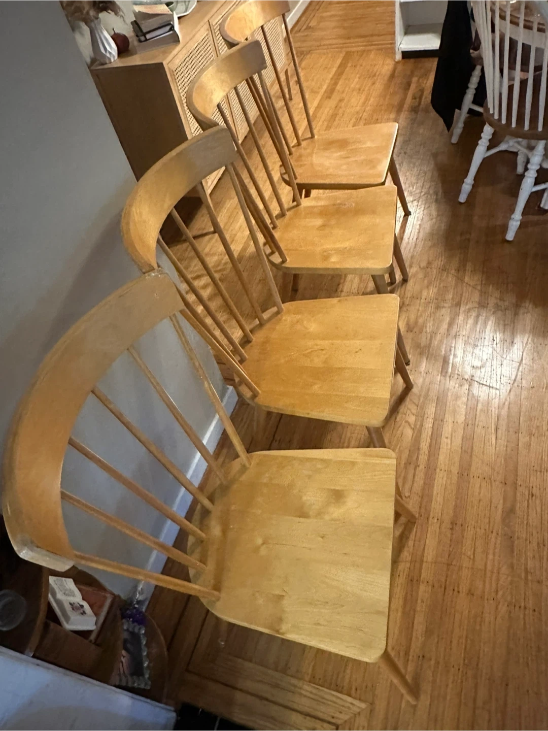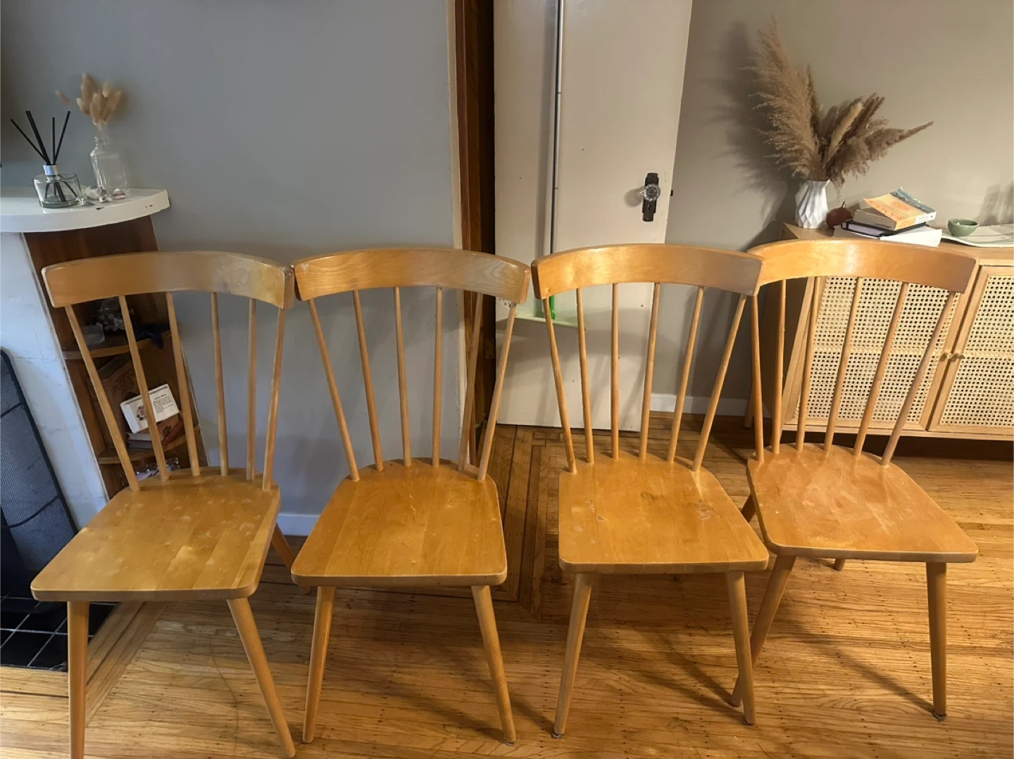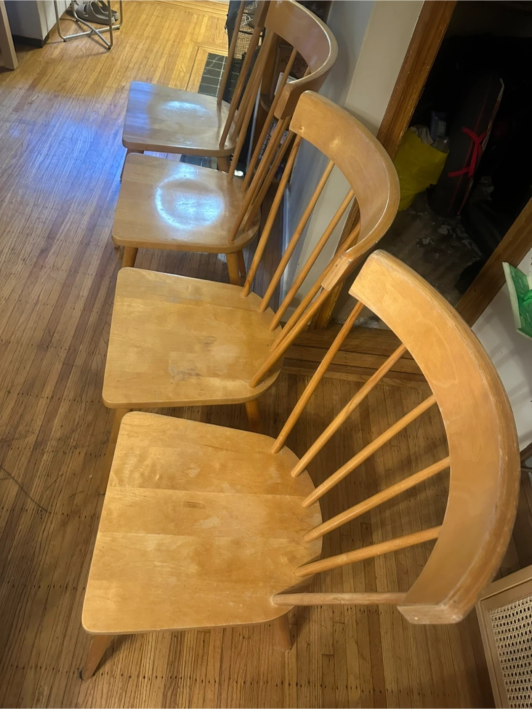 Selling a set of four vintage wooden dining chairs. They're sturdy and have a classic design that would look great in any dining room or kitchen. They've got a light wood finish and are in good condition for their age. Perfect for adding a touch of retro charm to your home!