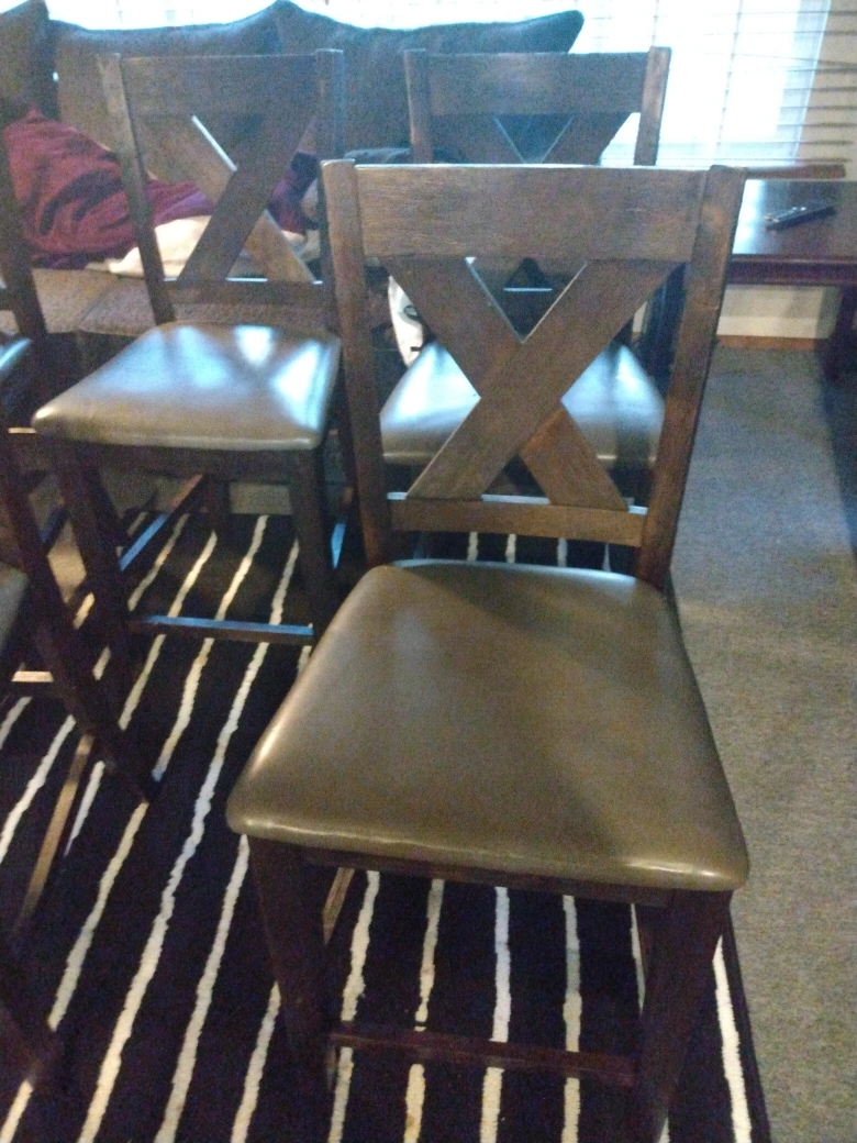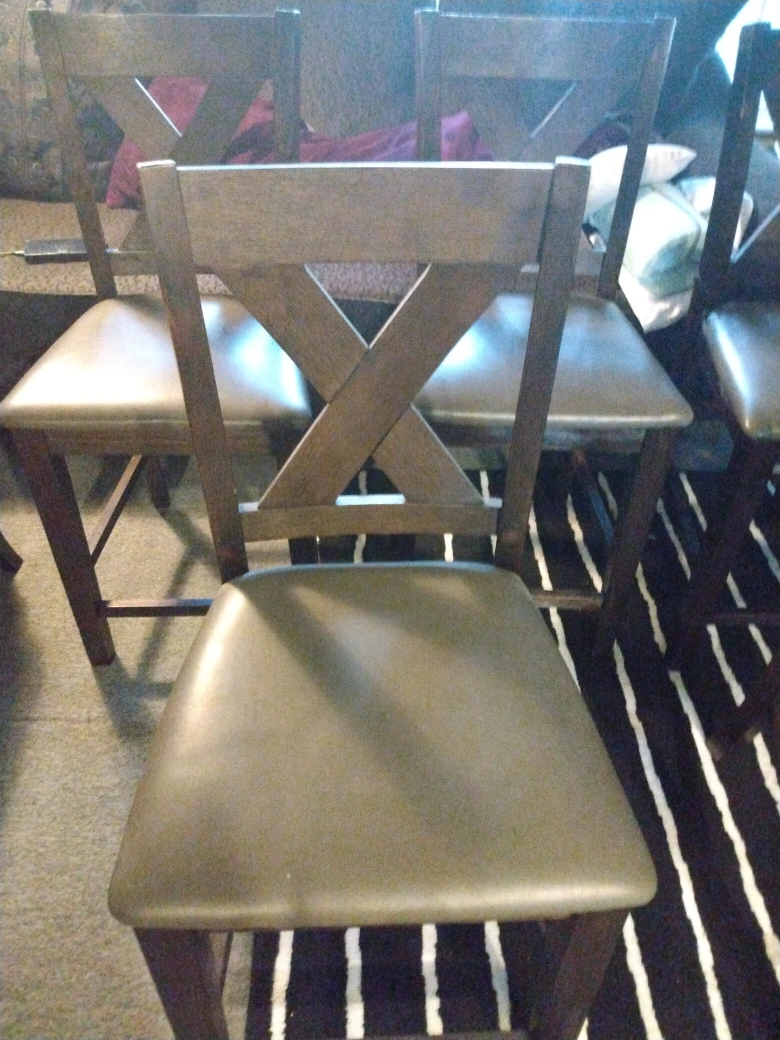 Selling a set of four sturdy dining chairs! They feature a stylish cross-back design and a comfortable, neutral-toned seat. Perfect for adding a touch of rustic charm to your dining area or kitchen COUNTER HEIGHT