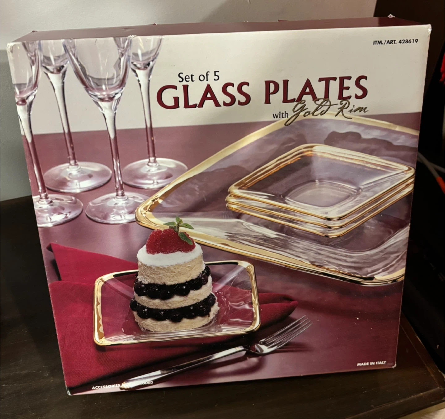Selling a set of 5 glass plates with a gold rim! These elegant plates are perfect for adding a touch of sophistication to any table setting. The set comes in its original box, ensuring they're well-protected