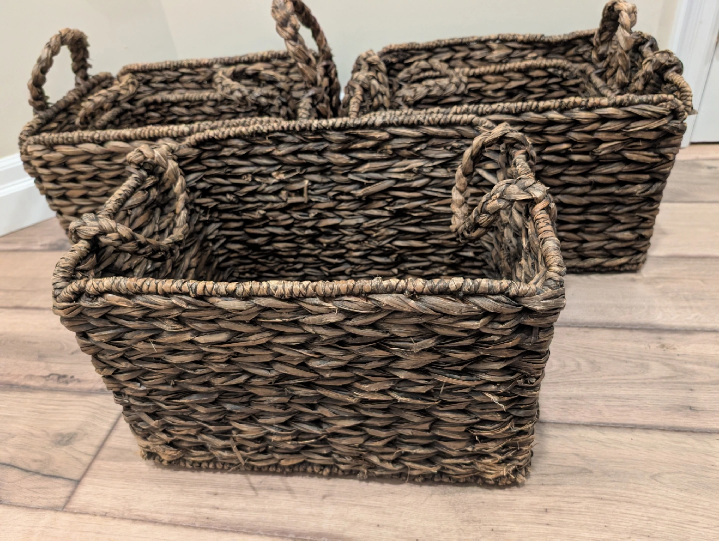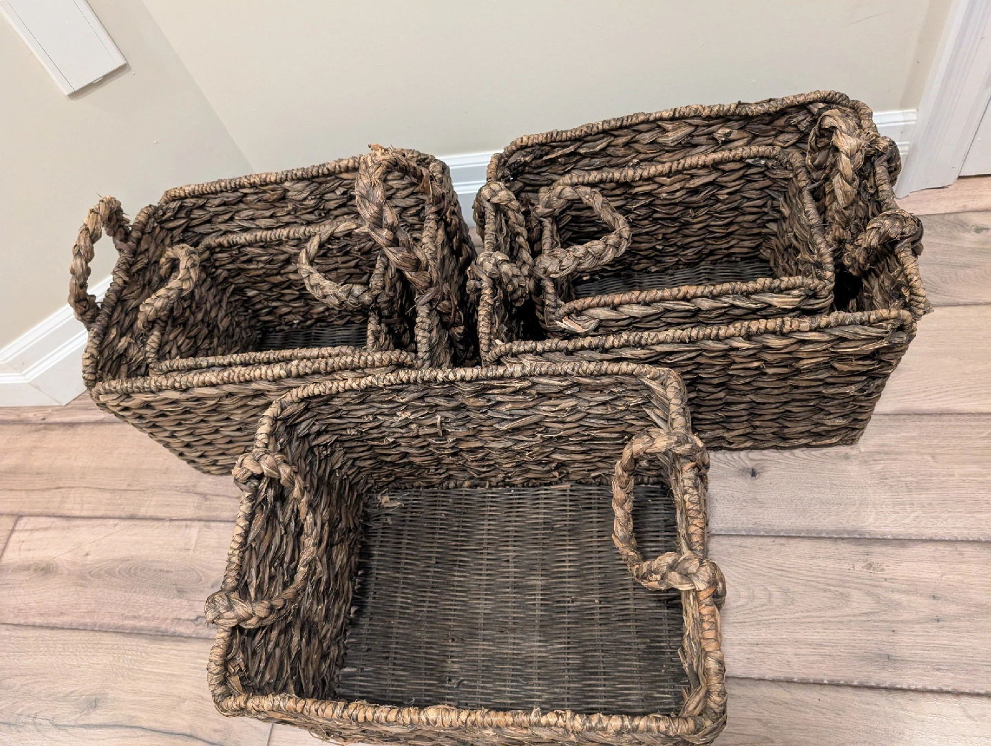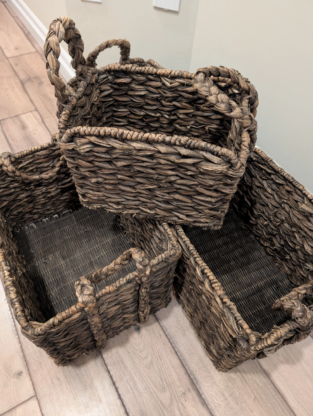Selling a set of five woven baskets. They're perfect for storage or decor. The baskets are in great condition and ready for a new home!