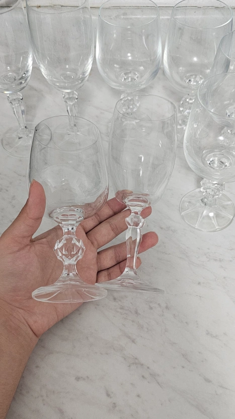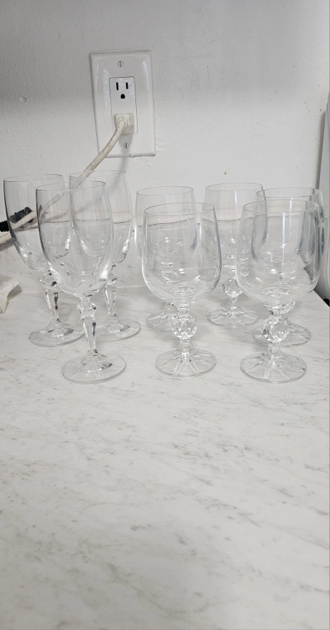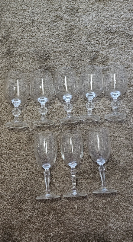 Selling a set of eight elegant wine glasses! They feature a beautiful design on the stem and are perfect for any occasion. They're in great condition and ready to add a touch of class to your next dinner party or get-together
