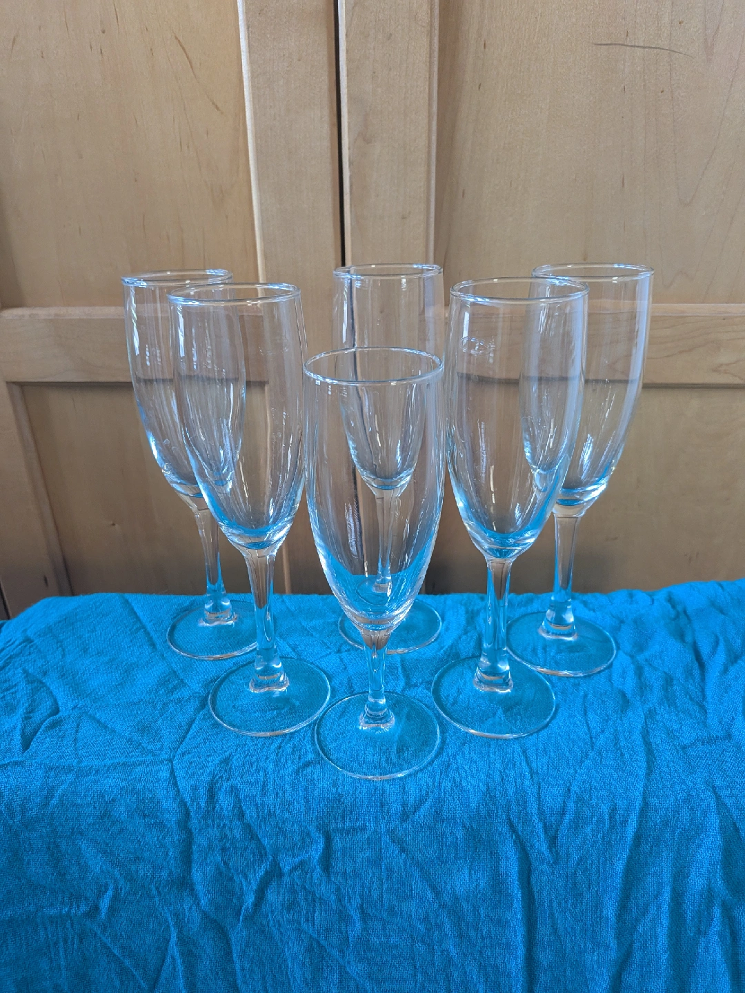 Selling a set of six elegant champagne flutes. They're perfect for celebrations or adding a touch of sophistication to any occasion. These glasses are in great condition and ready to find a new home