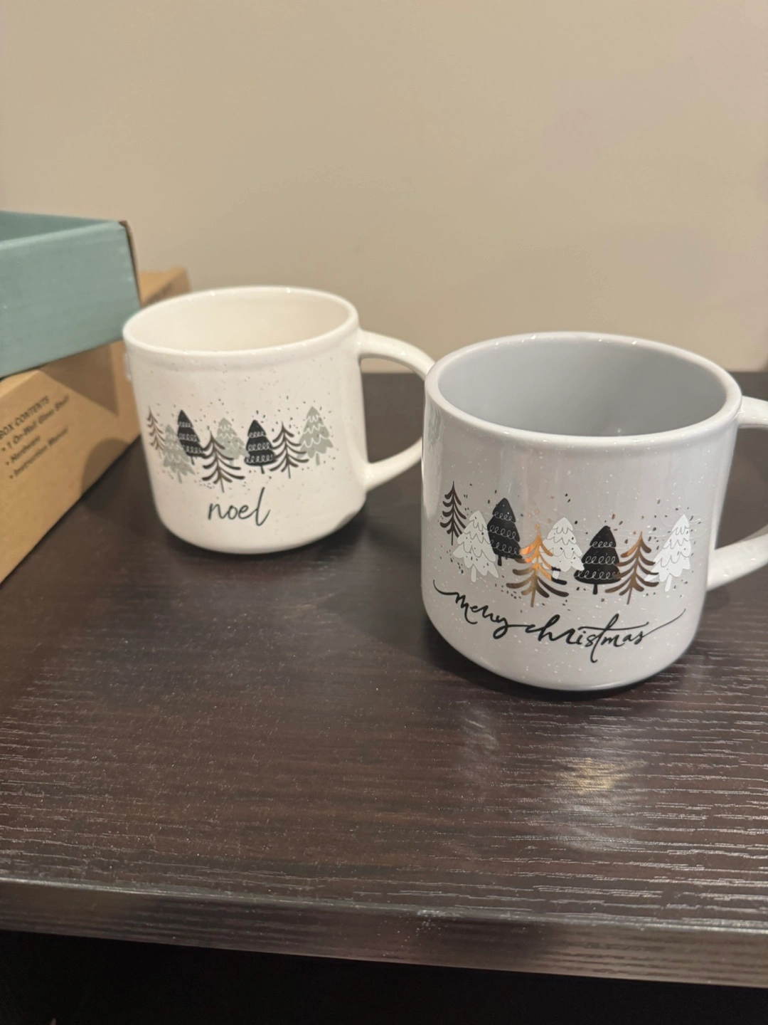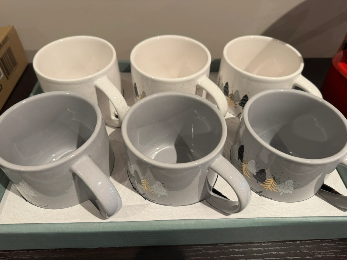 Six ceramic mugs, three white and three grey. Winter forest design. 'Noel' and 'Merry Christmas' inscriptions. Perfect for holiday gatherings. Barely used for one Christmas season. No longer needed. $10 pick up only