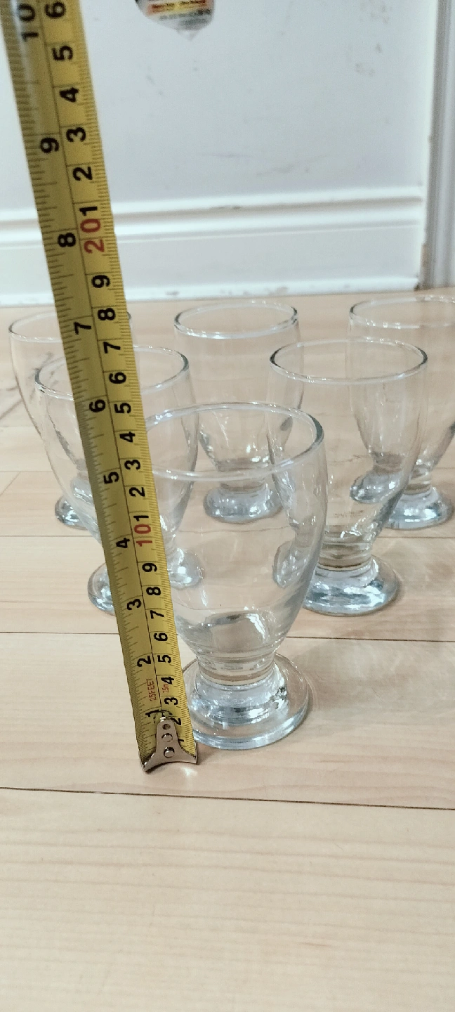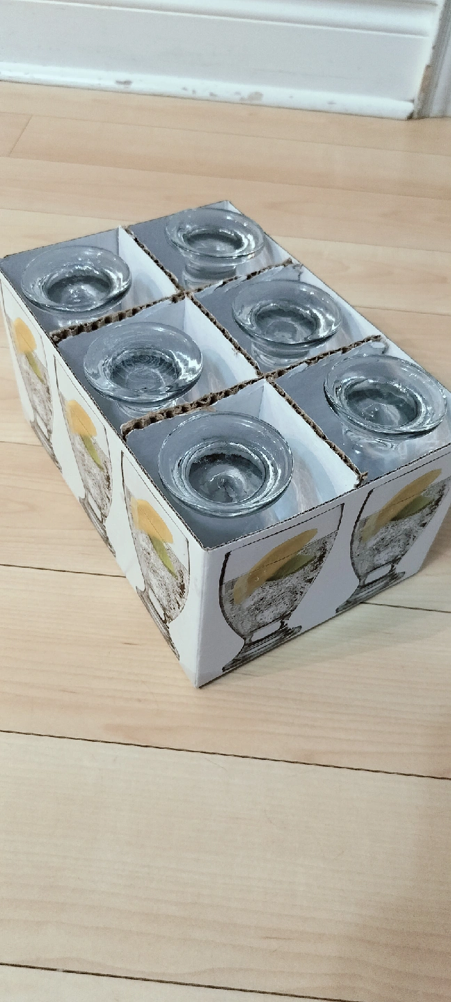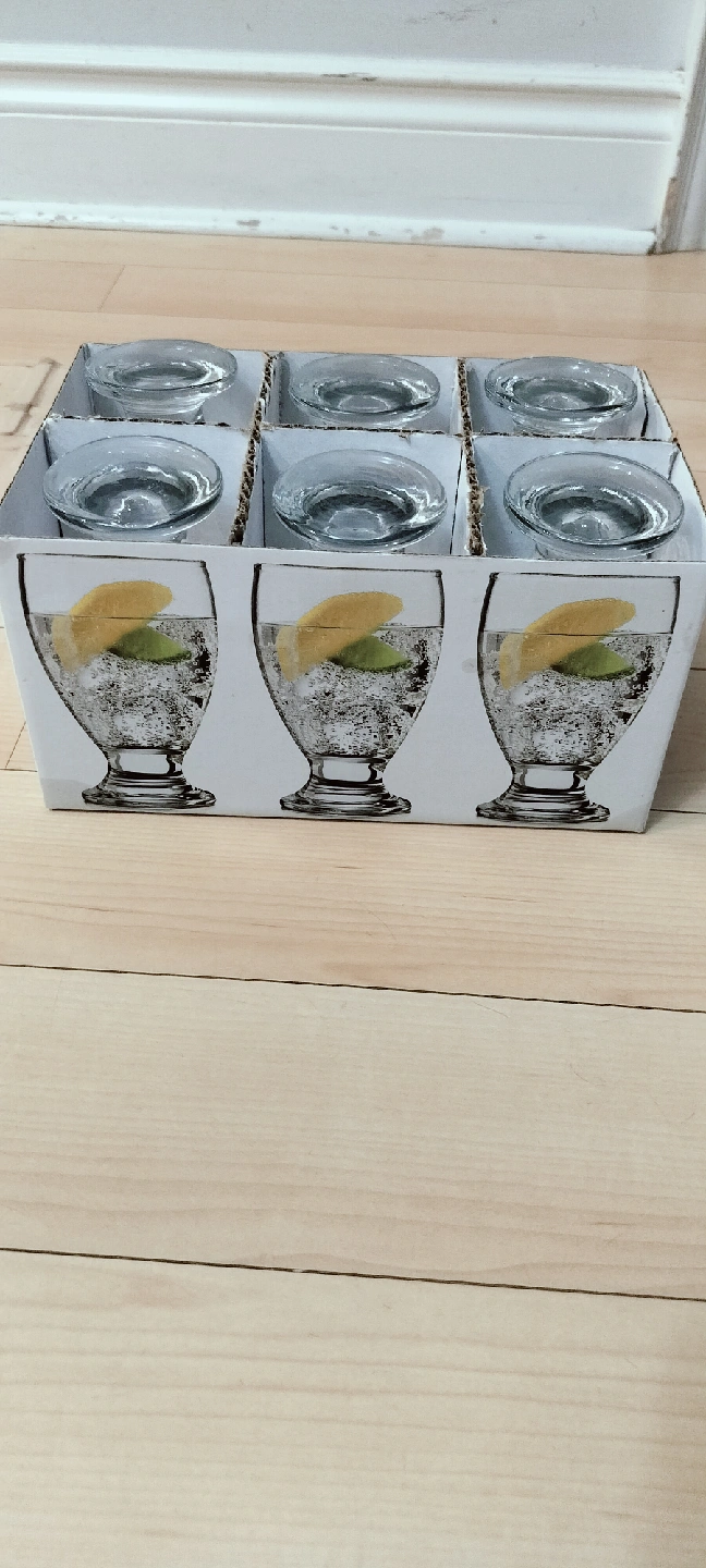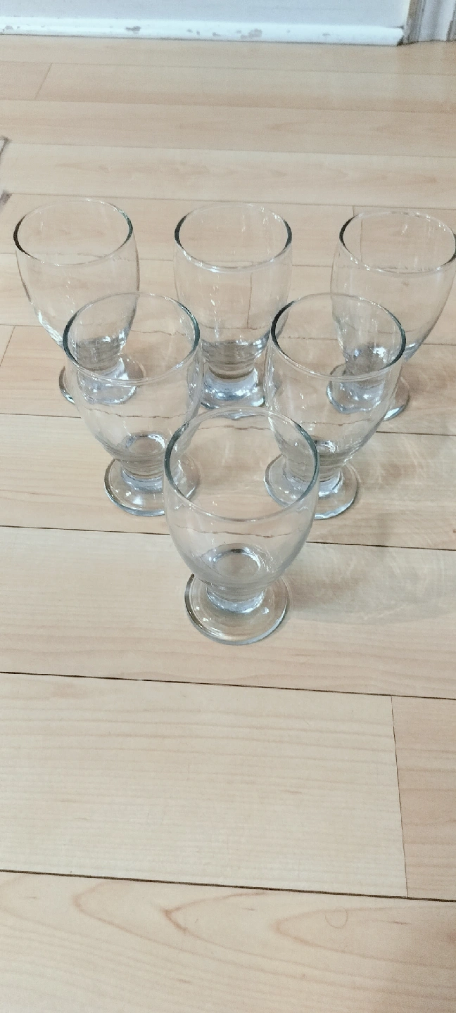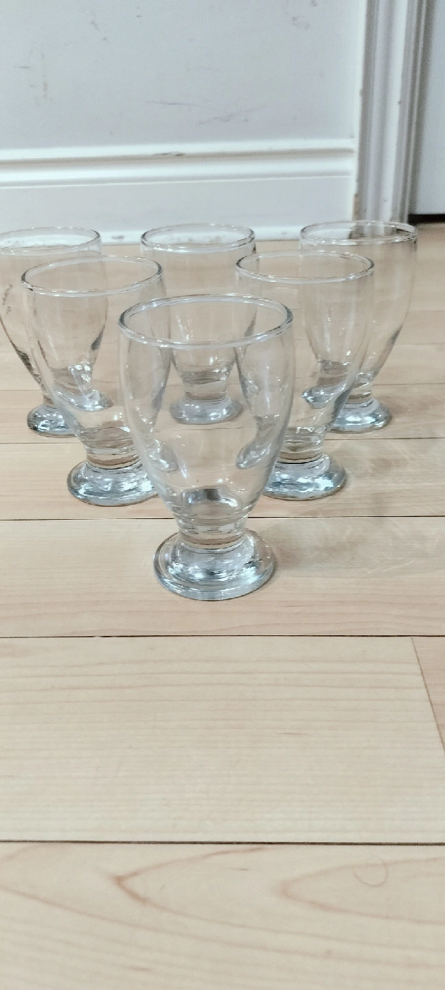 Move out sale. Selling a set of six footed dessert glasses, like new in the original box! They're clear glass and about 5 inches tall. Perfect for desserts or cocktails or even water. Pick up at 23 Cox Boulevard Markham.