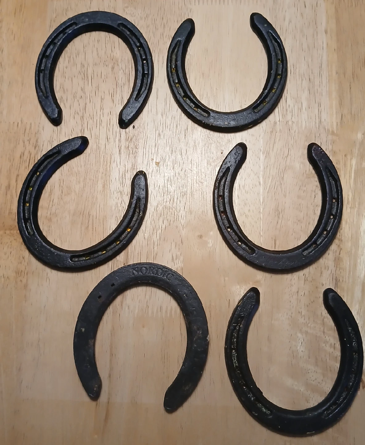 45Selling a set of six used horseshoes. They are marked with the brand "NORDIC". Great for crafts or decoration!Pony size