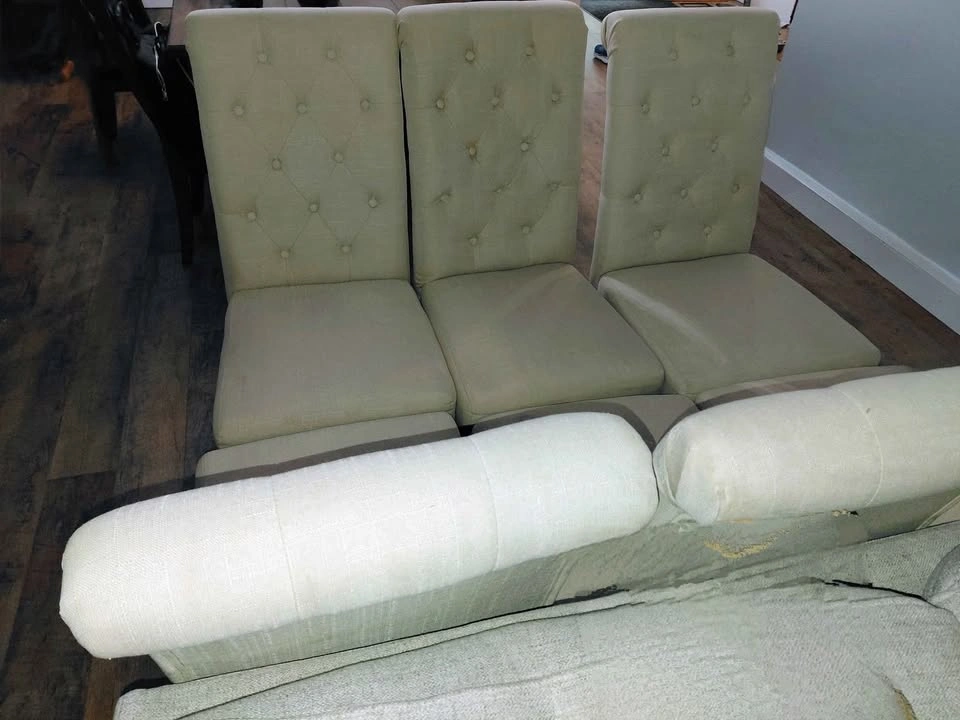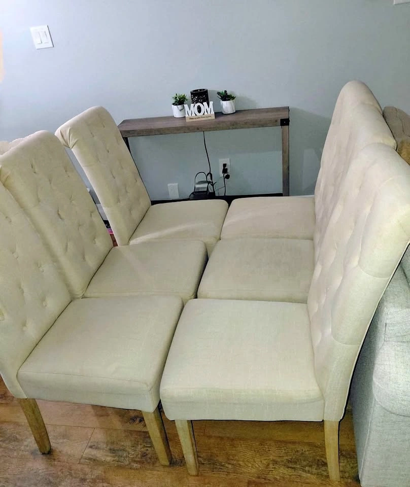 Selling 6 dining chairs purchased from Wayfair. Light beige upholstery on the seats, with light brown / wood tone legs. In good condition — always covered during use; just a couple of small stains. Very comfortable and solid build. Pick up Downey Road and Teal Drive