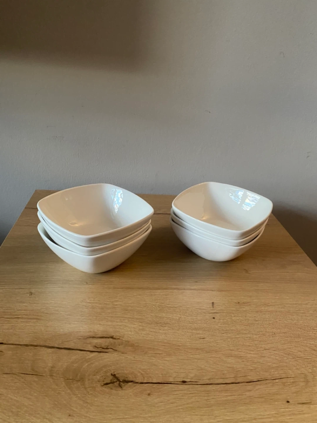 Selling a set of 6 square white bowls. These are perfect for serving snacks, desserts, or side dishes! They're in great condition and ready for a new home
