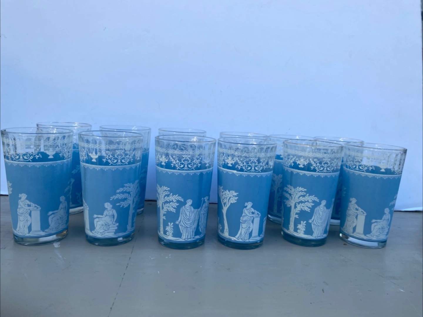 Selling a set of 8 lovely glasses! They feature a beautiful blue background with white Greek-style scenes. These glasses are perfect for adding a touch of elegance to your table setting or for everyday use