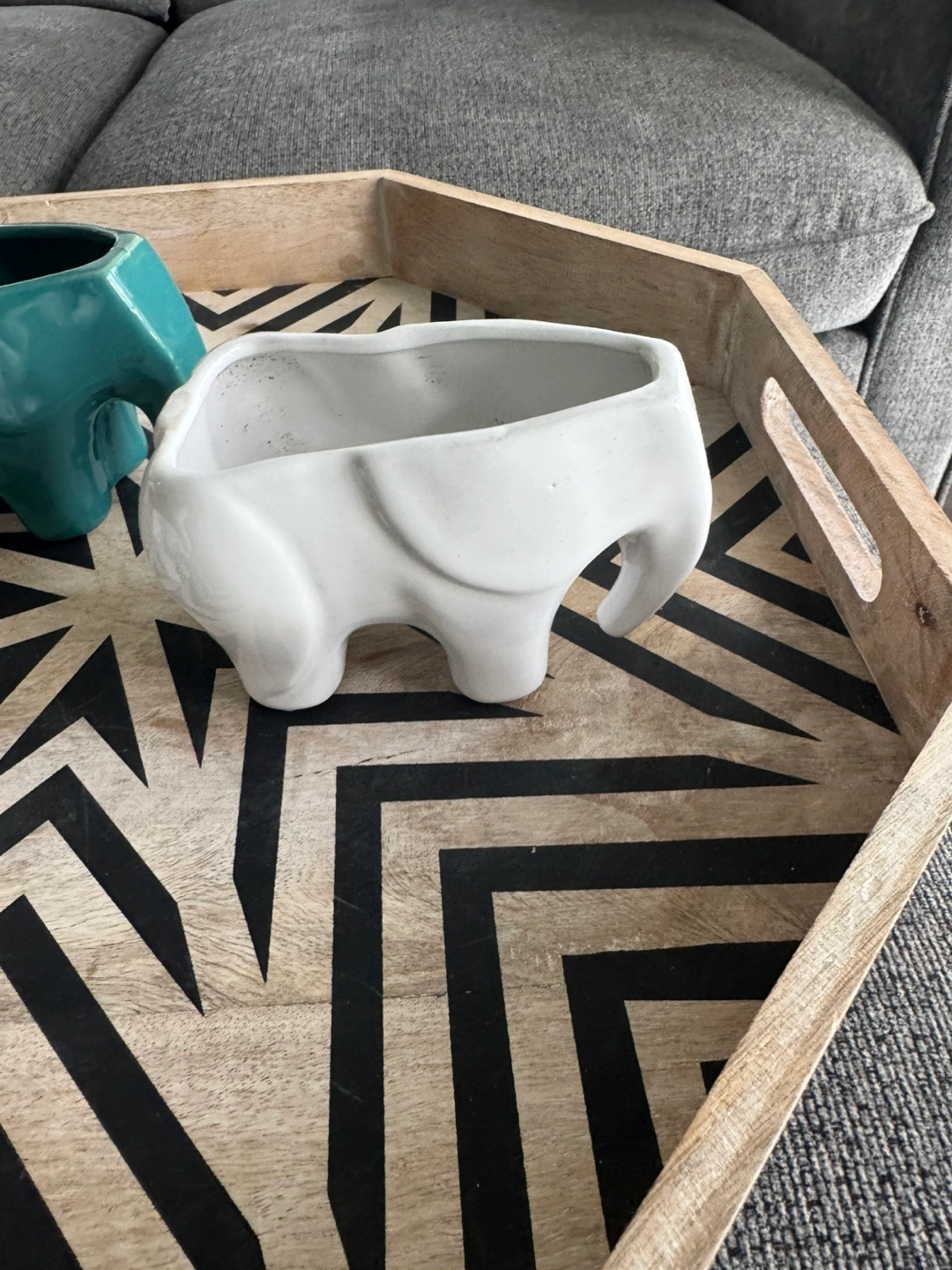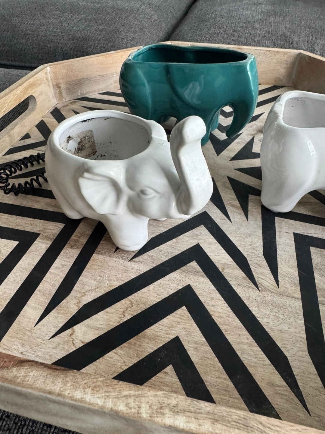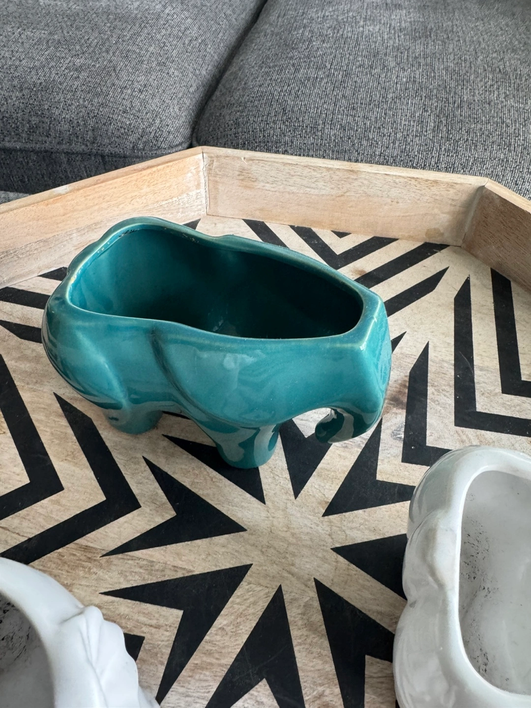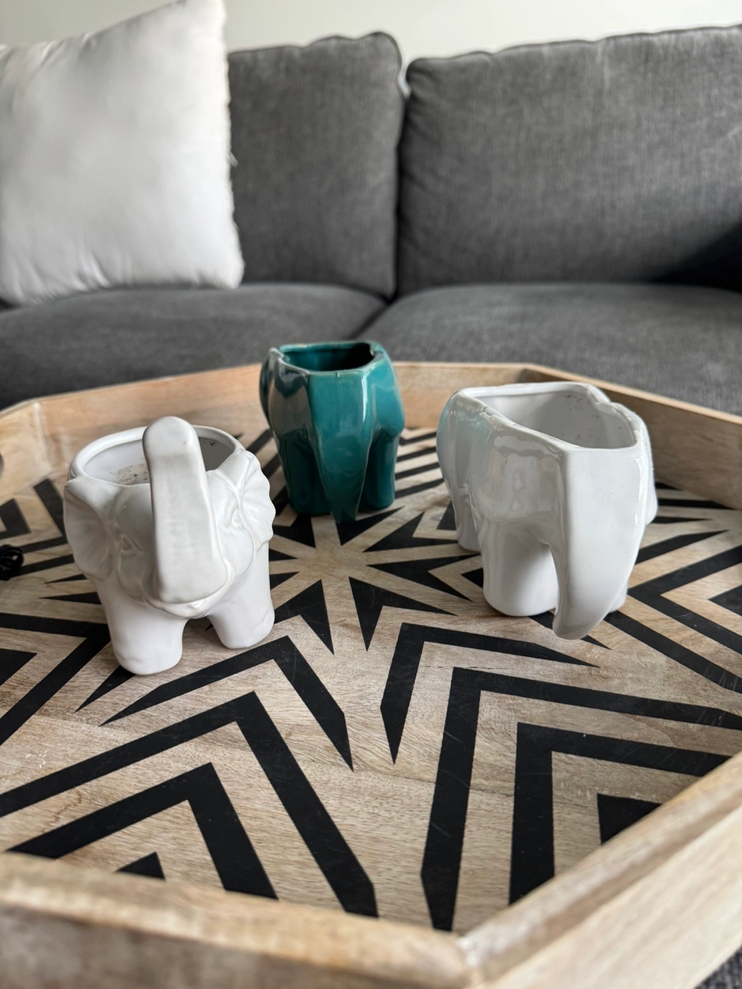 63These charming elephant-shaped ceramic pots come in three different colours. Perfect for your little plants or succulents. Display them on a decorative tray for a calming display in your home. $20 each