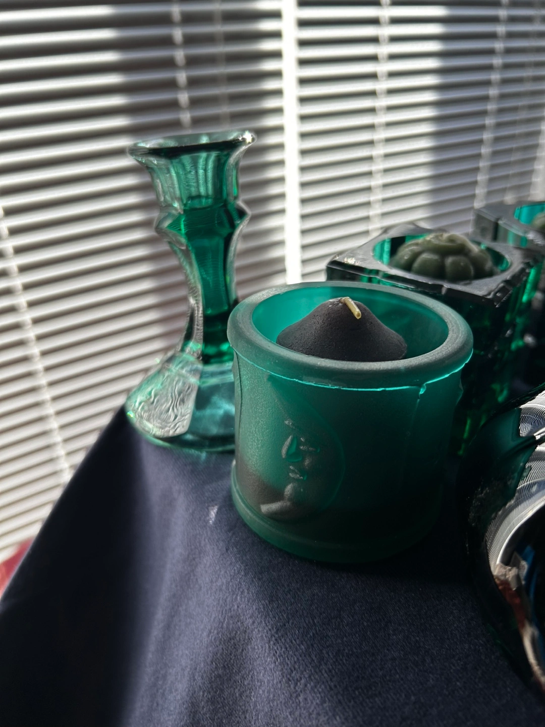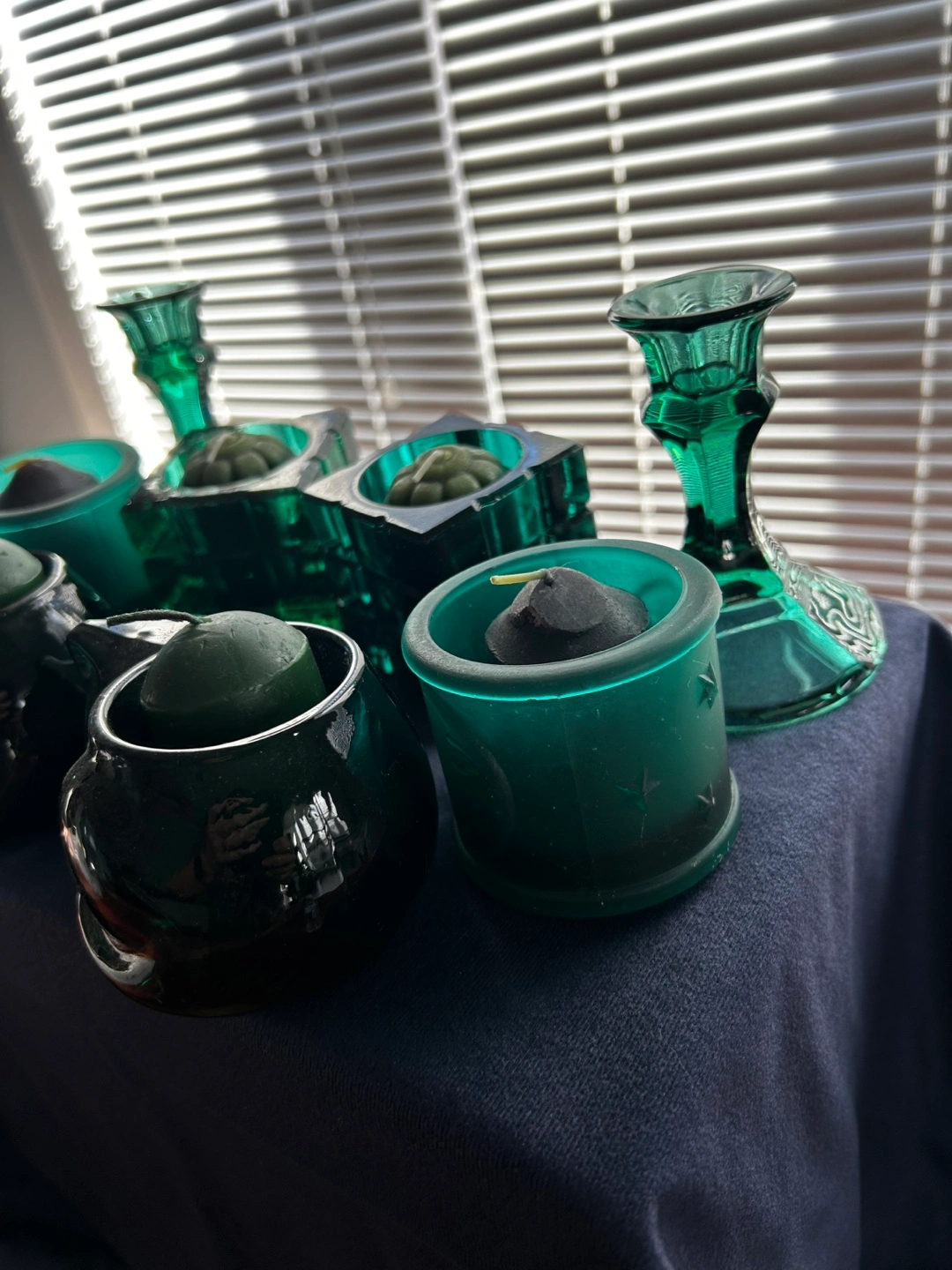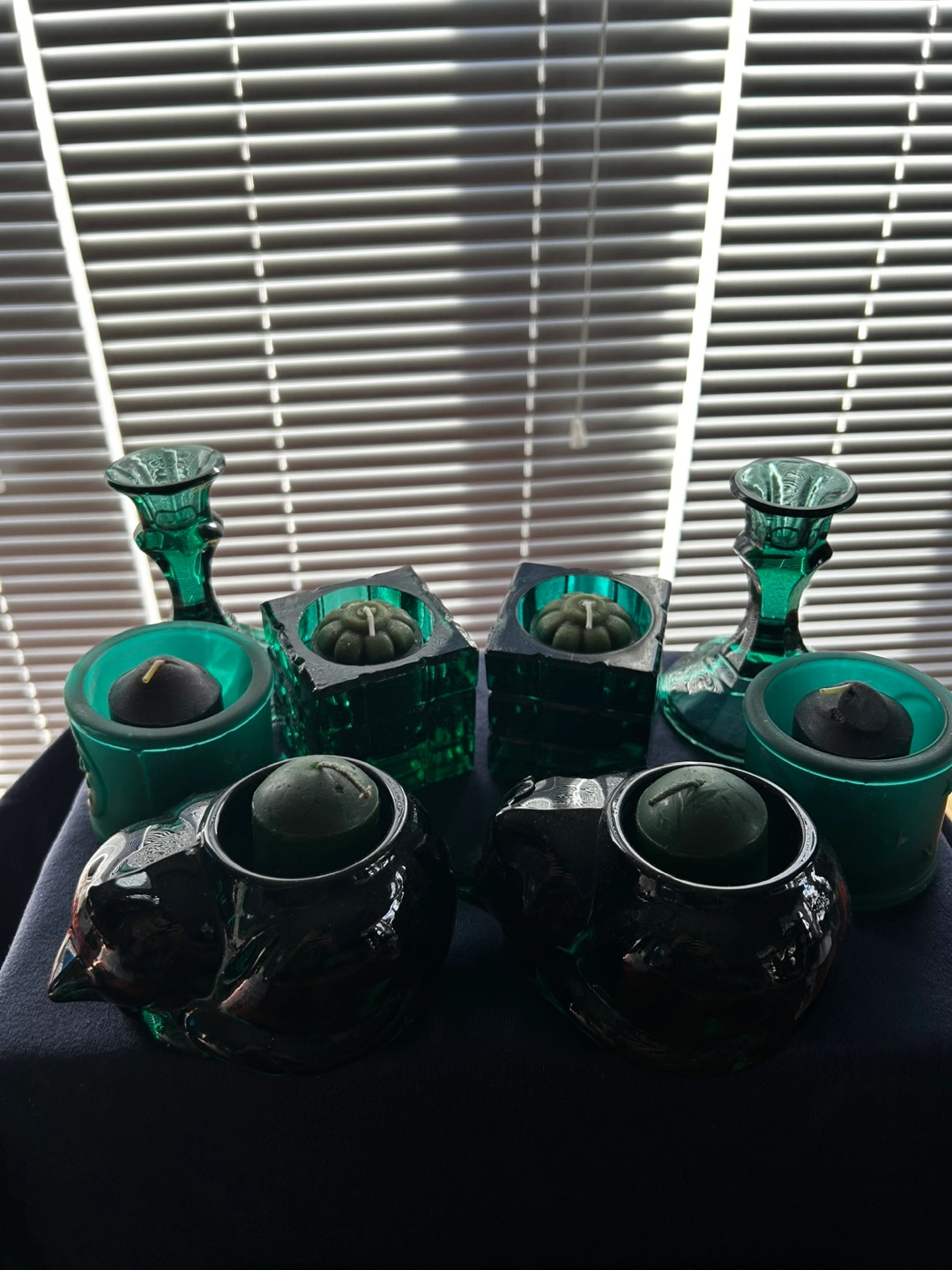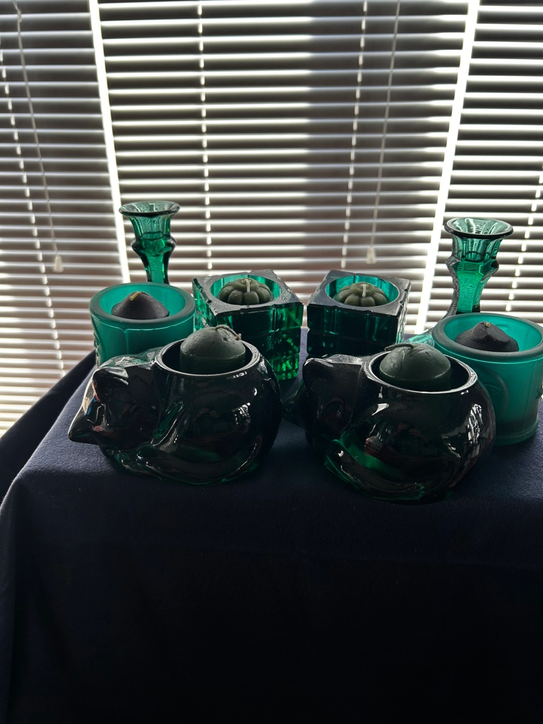 74Eight teal glass candle holders. Includes two small votive holders, two square holders, two larger holders shaped like kittens and two candlestick holders. Teal coloured glass. Small, round, dark green candles included.