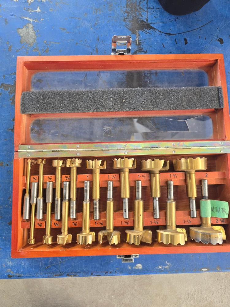 18Collection of forstner bits, various sizes, stored in a wooden carrying case. Sizes range from 1/4 inch to 2-1/8 inches.