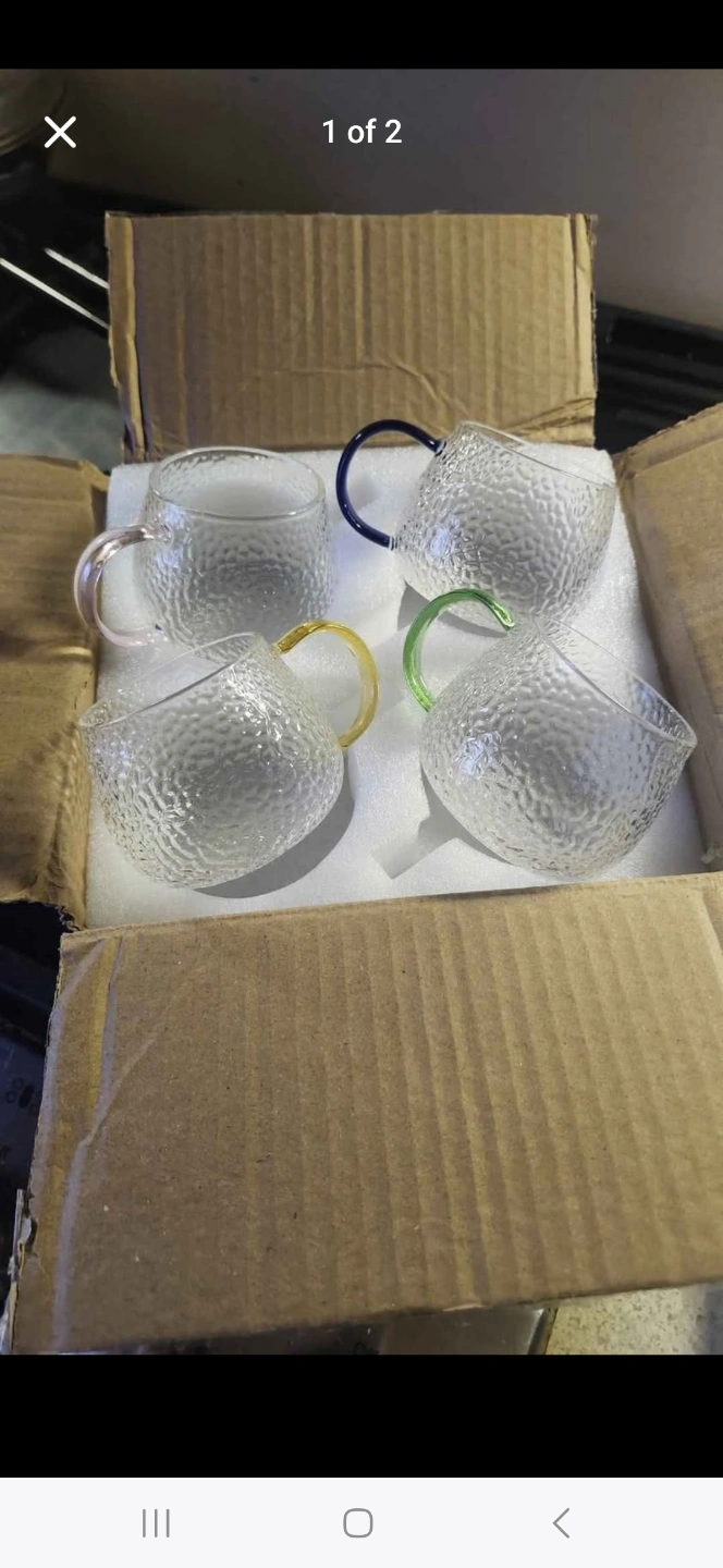 Four unique glass mugs. Each mug features a textured exterior and a coloured handle. New in box.