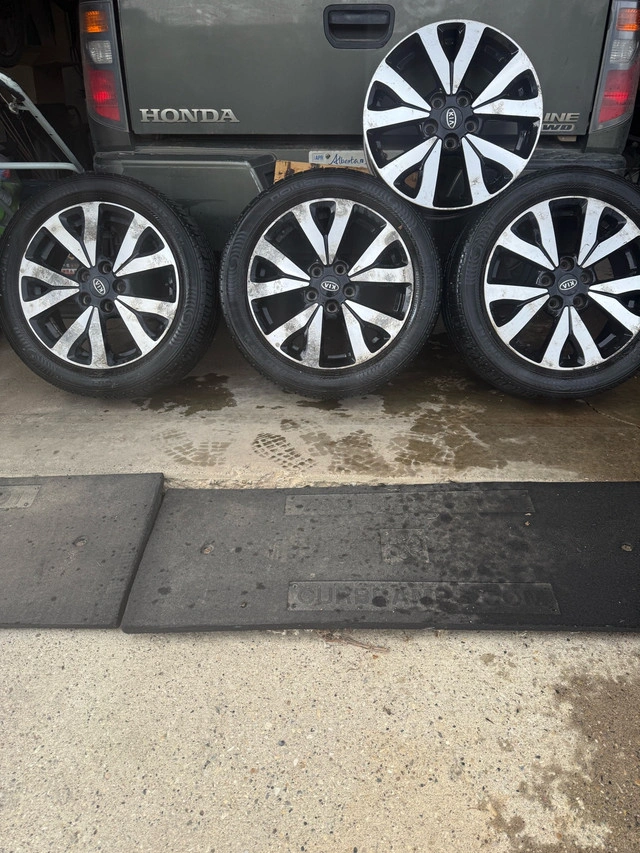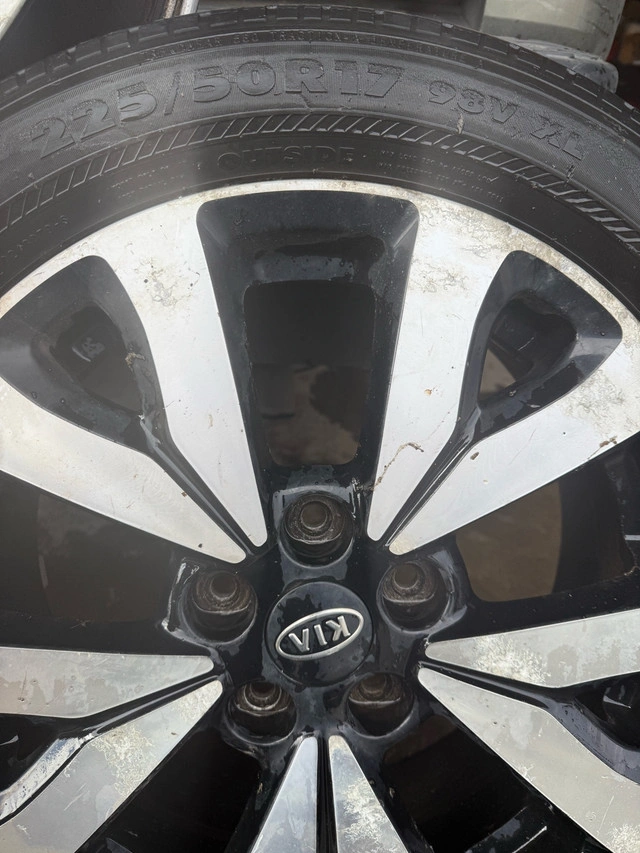 10Selling a set of Kia rims with tires; the tires are no good, but the rims are still in decent shape. They are used and show signs of wear, as you can see in the photos. These rims would be perfect if you need a replacement set or want to switch up your current wheels. I'm selling these for a reasonable price, considering the condition. If the ad is up, they're available! Tire size (diameter): 17 in.