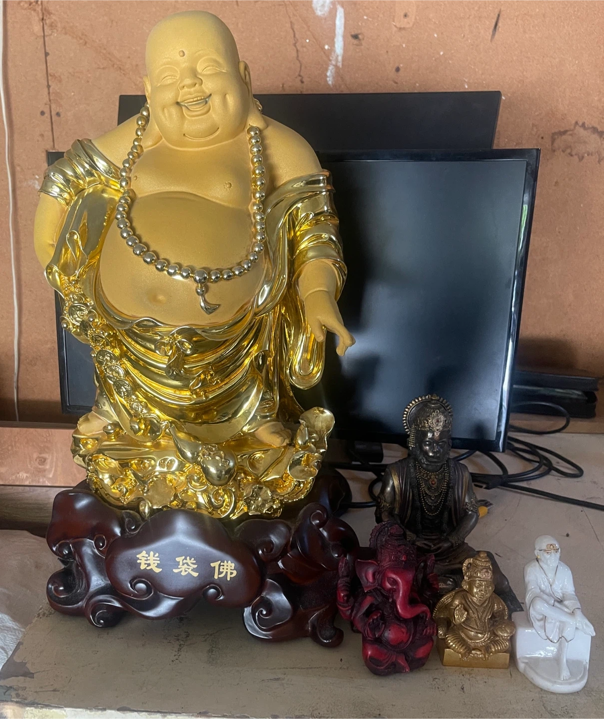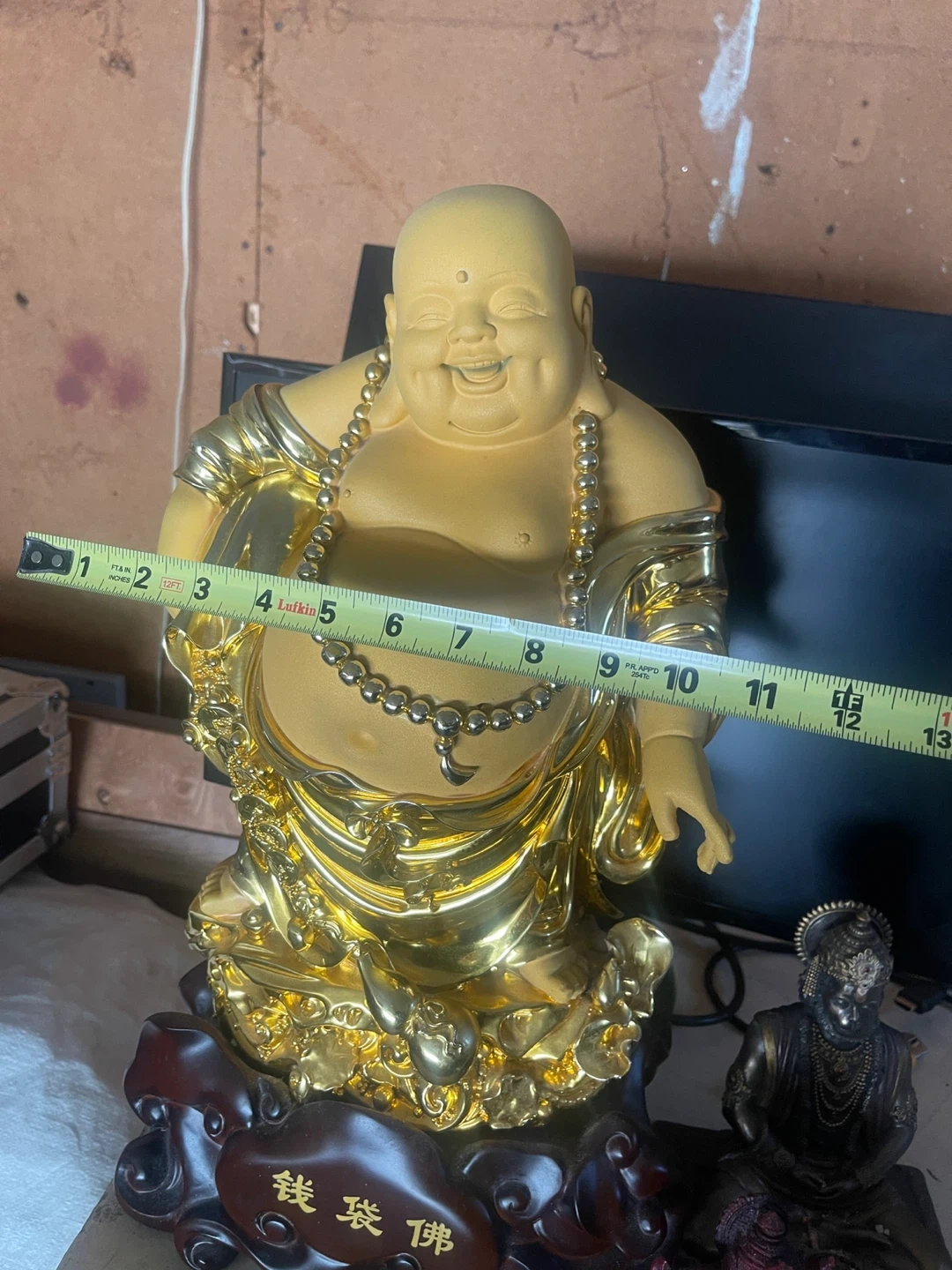 Here's a golden Buddha statue, standing approximately 19 inches tall. It's a beautiful piece to add to any collection or as a standalone decorative item.