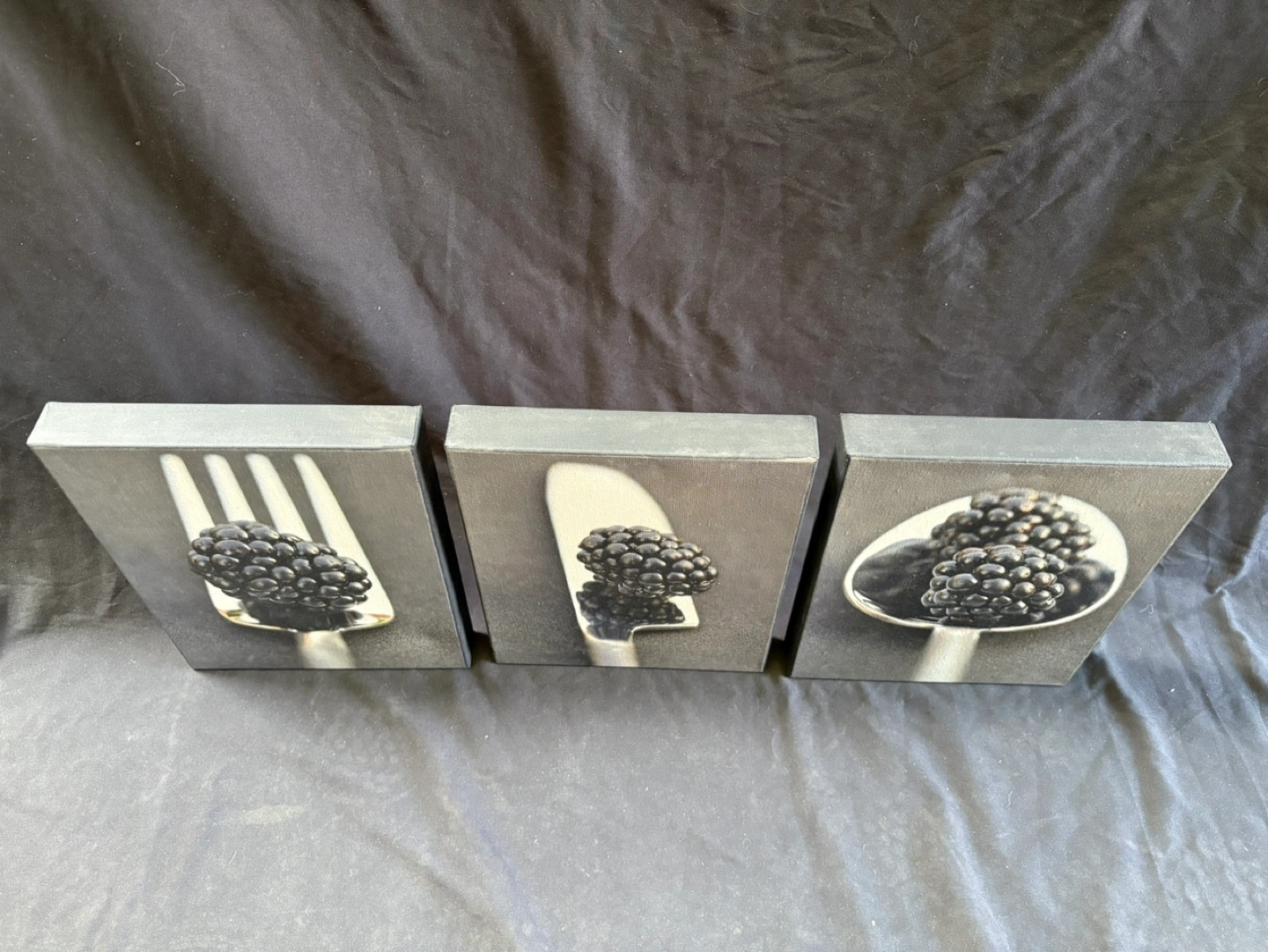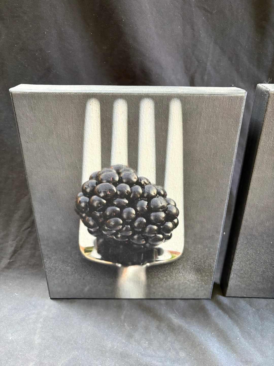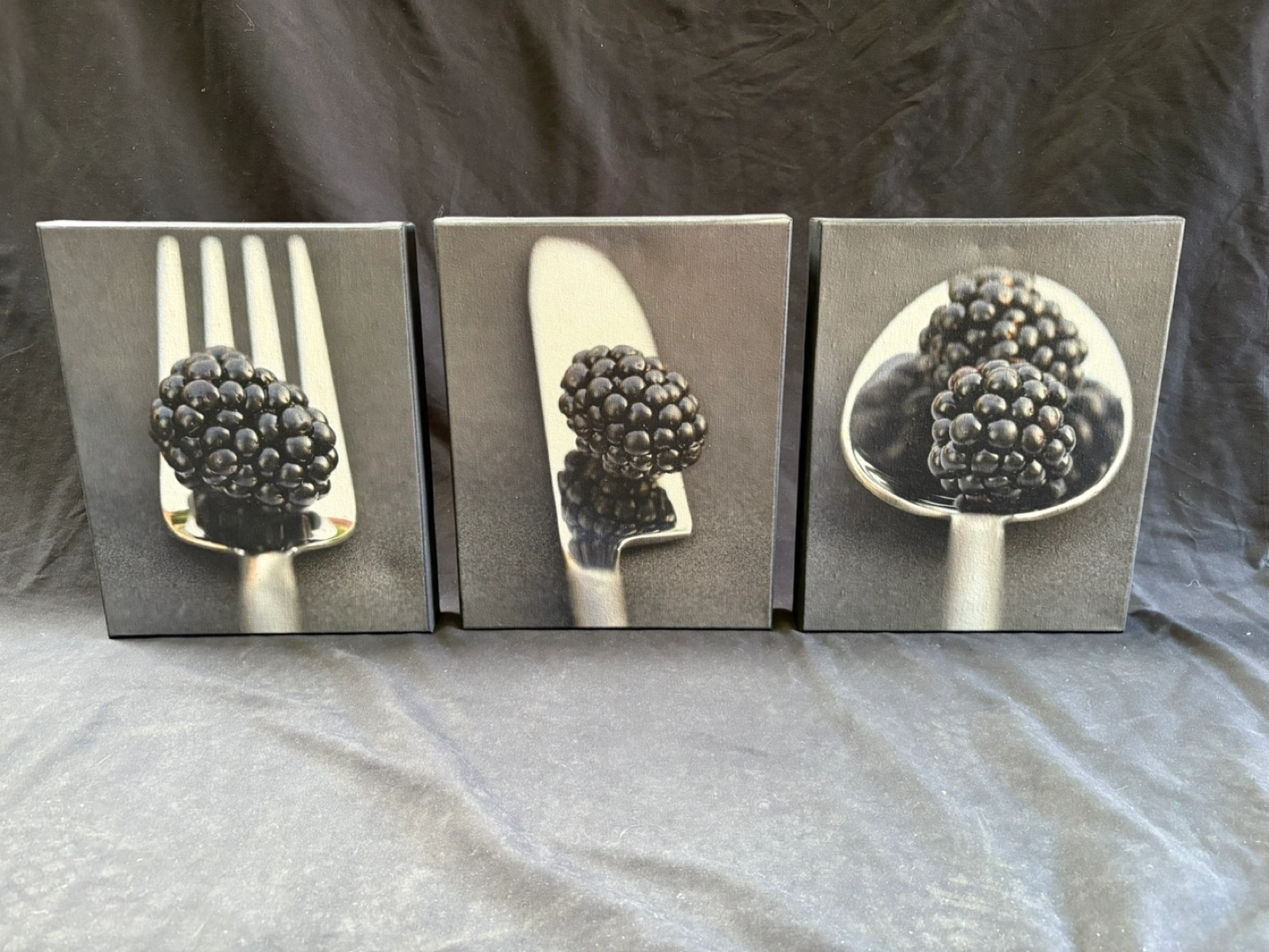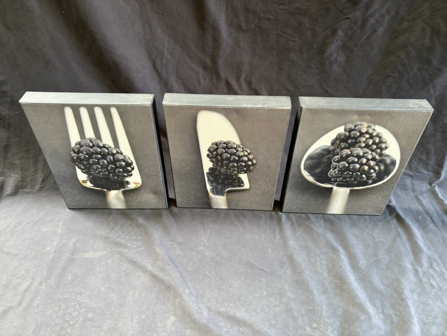 1000+Like new Three framed canvas prints. Black and white photography. Blackberries on a fork, knife, and spoon. Kitchen decor. Modern minimalist style. $3 Pick up Victoria park & O’Connor area