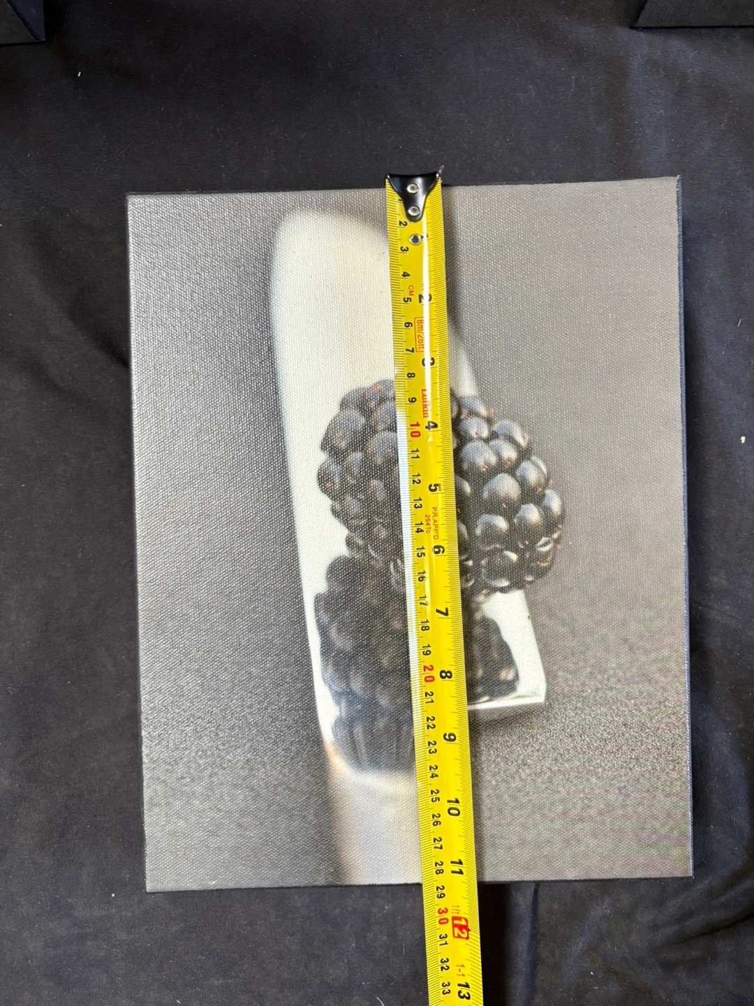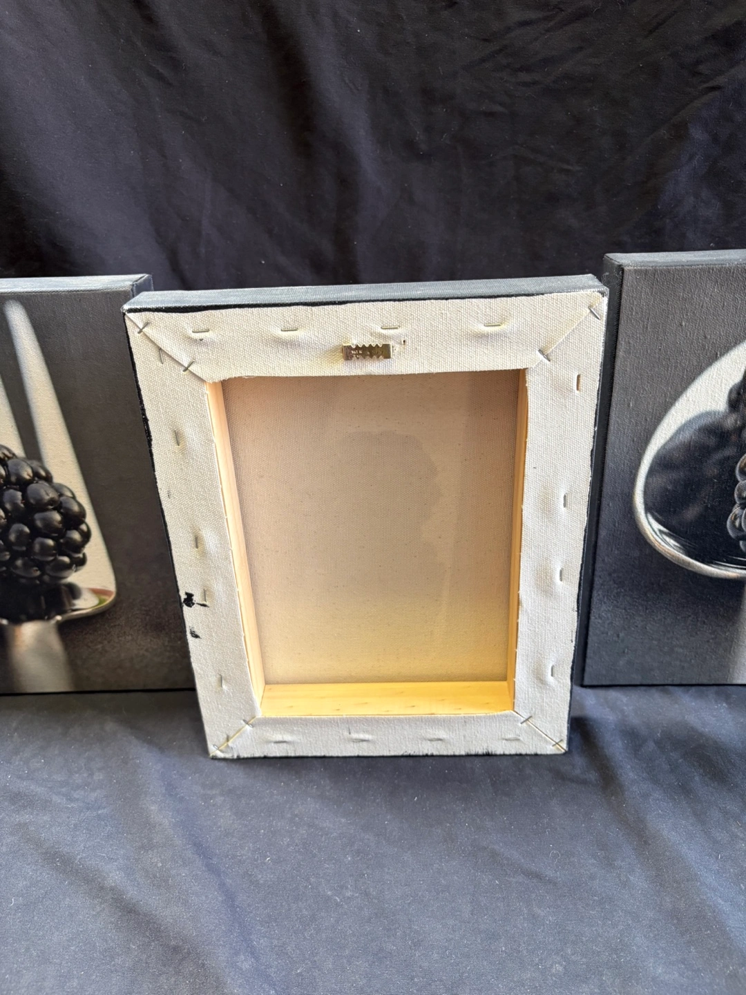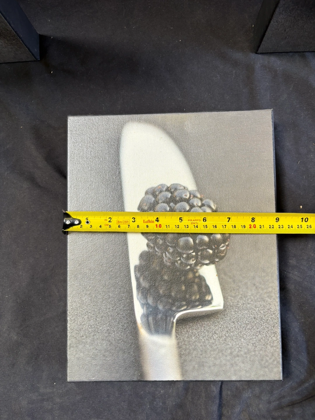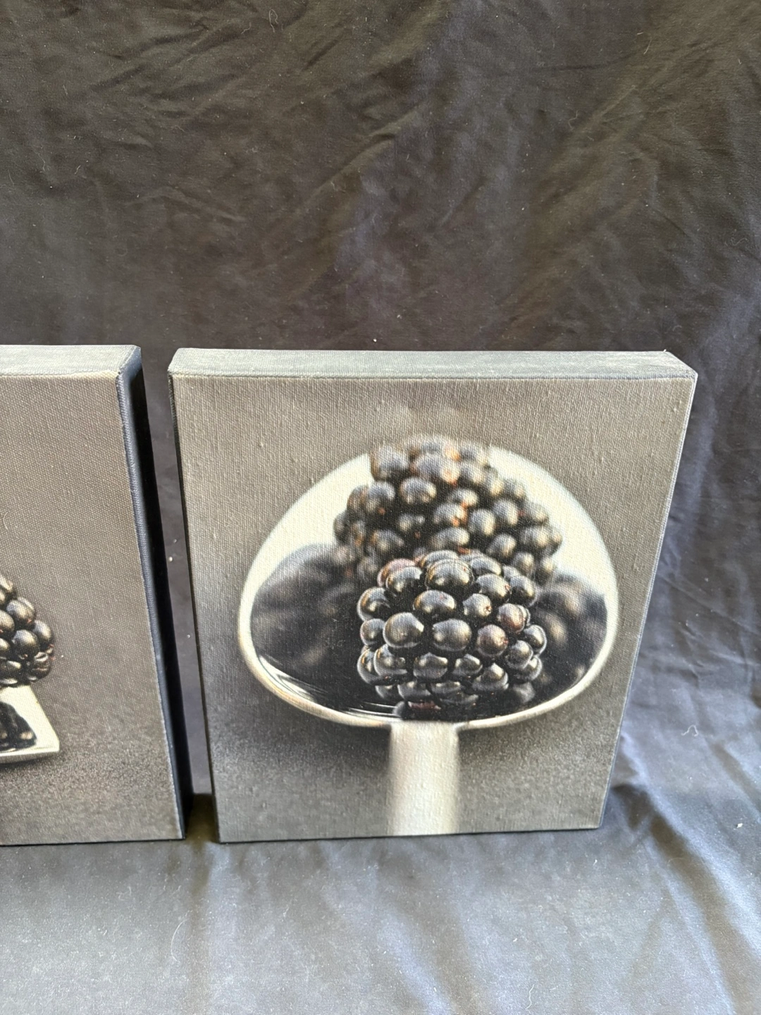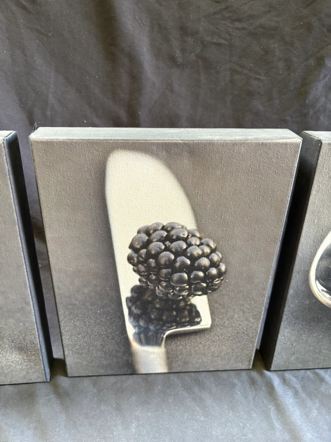 1000+Like new Three framed canvas prints. Black and white photography. Blackberries on a fork, knife, and spoon. Kitchen decor. Modern minimalist style. $3 Pick up Victoria park & O’Connor area