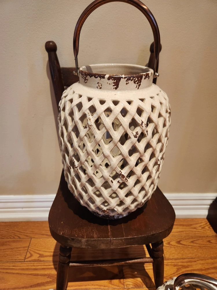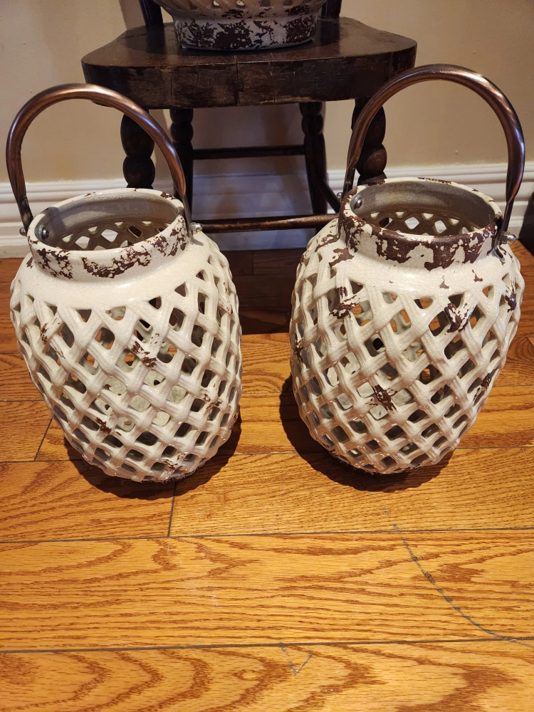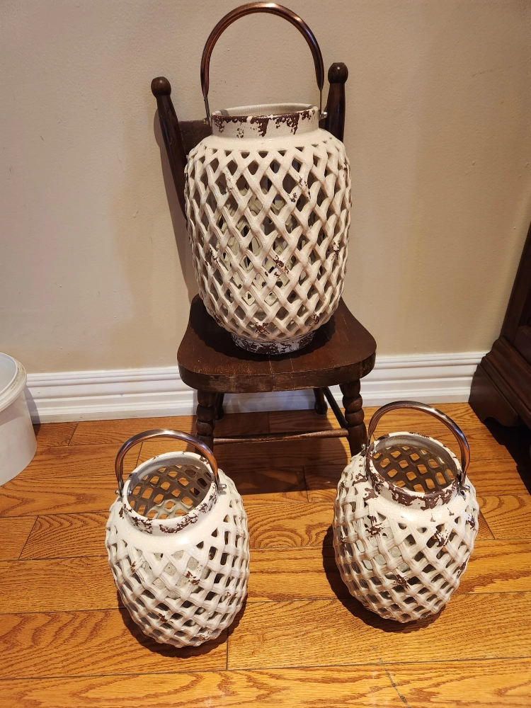 Three off-white ceramic lanterns. Distressed finish. Metal handles. Perfect for candles or decorative accents.