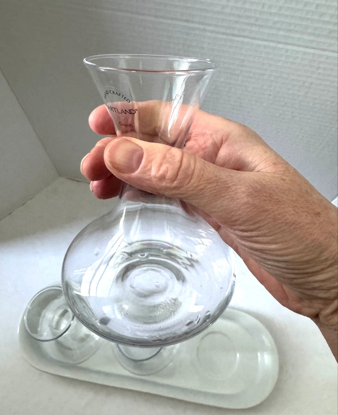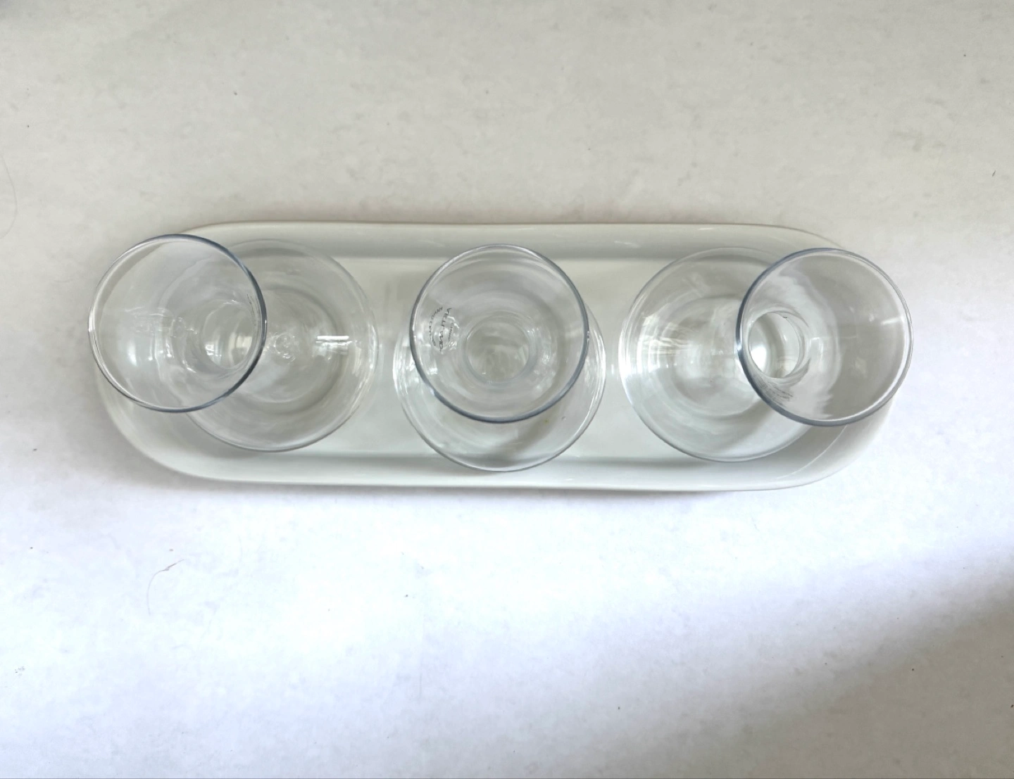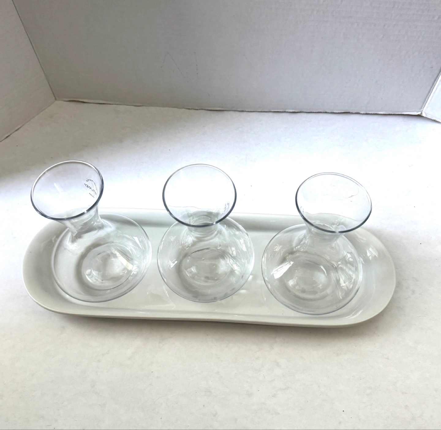 115Three small glass decanters on a white serving tray. Perfect for wine tasting or for oil or vinegar serving Cash only. Pick up Broadview Ave/ Pottery rd or meet Broadview Station