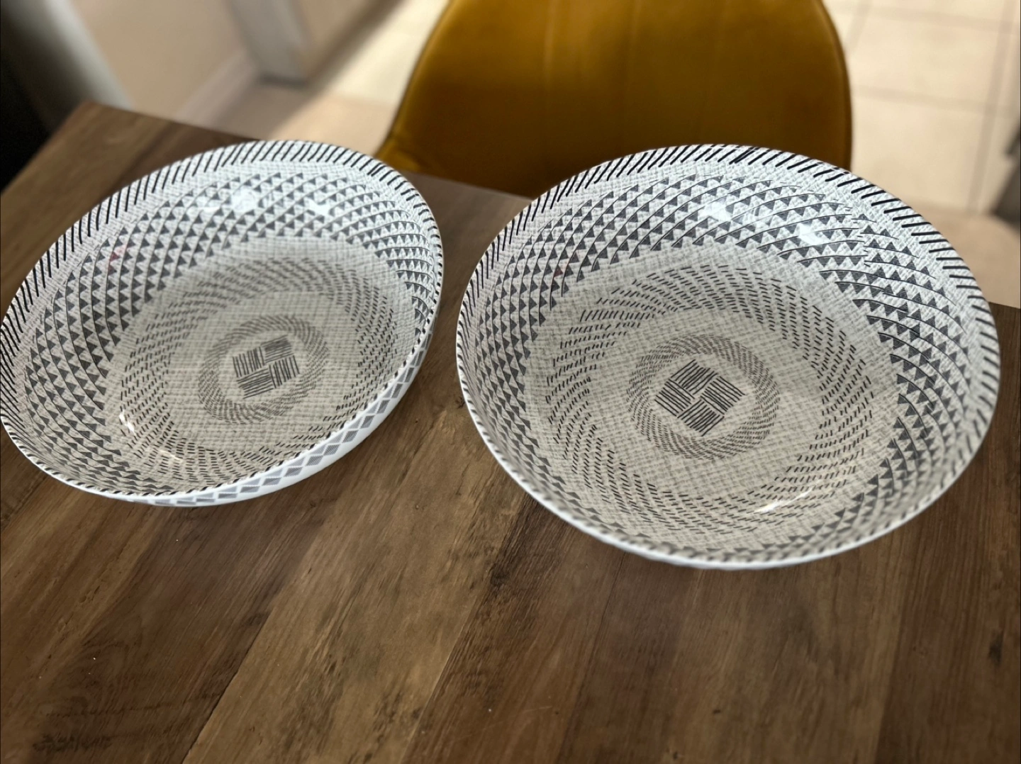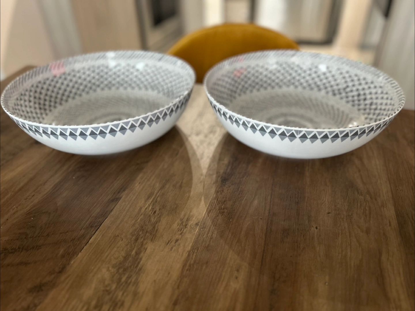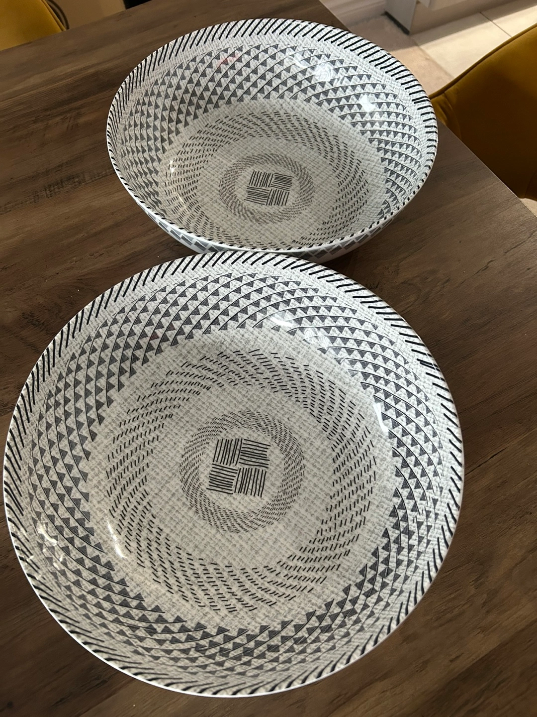 20Beautiful set of two bowls. White bowls with a geometric design in shades of grey. Large plastic bowls. Never used