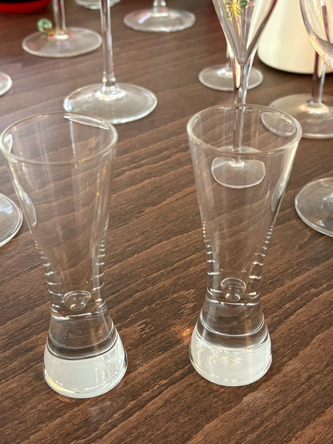 18Pair of clear glass shot glasses. Unique design. Small, elegant size. Perfect for liquor or dessert.