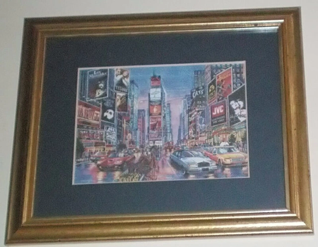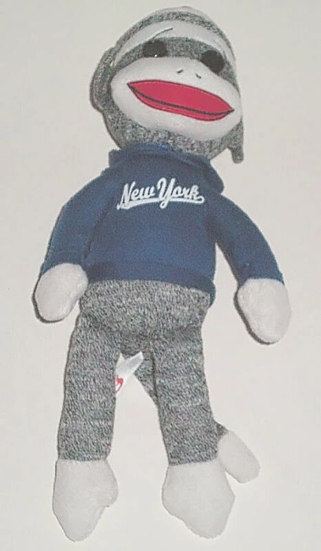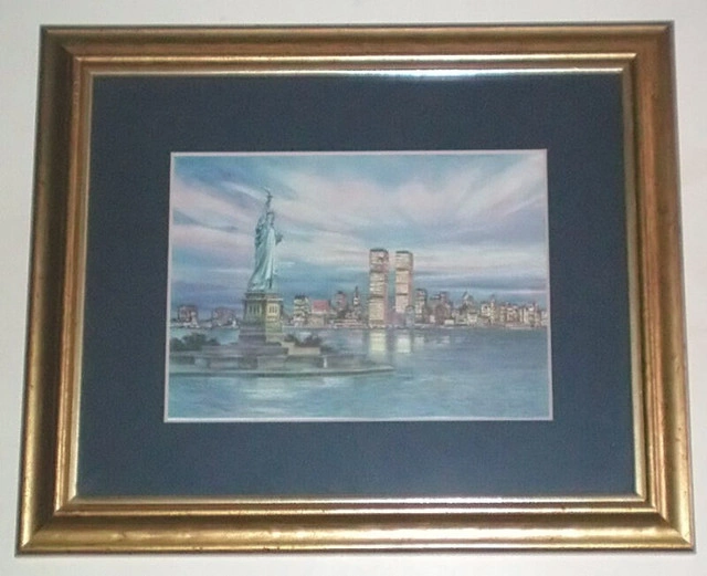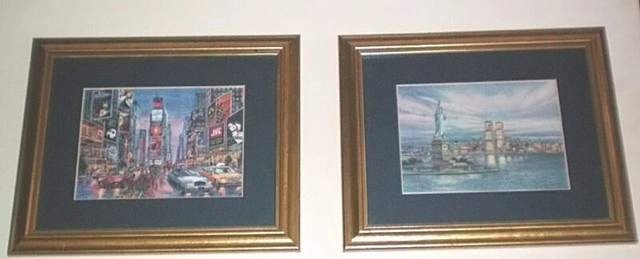 Set of Two NY City Matted Framed Prints and Ty NY Sock Monkey. NY City Prints - Size: 11 5/8 x 9 5/8 - Print #1 is a scene depicting the Statue of Liberty & The New York City Skyline including the infamous Twin Towers - Print #2 shows a bustling Times Square in downtown NY. Both have gilt frames, glass covers and navy blue matting. Both can either hang on wall or stand up. Condition: Both in excellent, like new shape. Priced at $25. Ty Beanie Baby Sock Monkey in New York Sweater - Size: 10 inches tall - Style 40964 - Introduced in July 2012 - New York is the place to be - Birthday (Date of Birth): May 7, 2012. Priced at $10 or get combined deal of $30 for both. Would make a great souvenir of a great trip to the Big Apple or a keepsake of how things were before 911