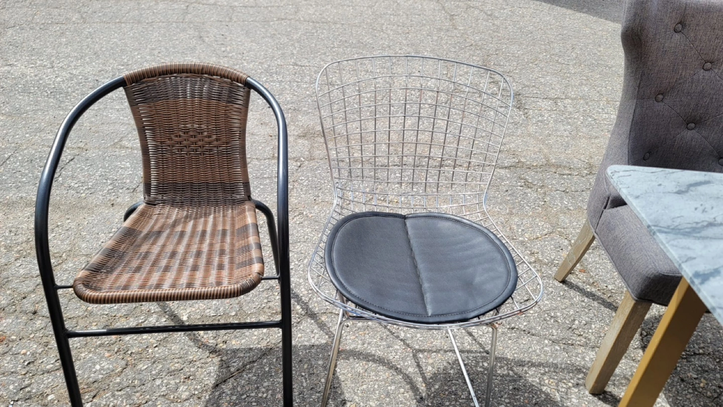 16A set of two chairs. Includes a wicker chair, wire-frame chair, and upholstered chair with a marble-like table top. These chairs would be perfect for hosting guests or just for enjoying a quiet moment.