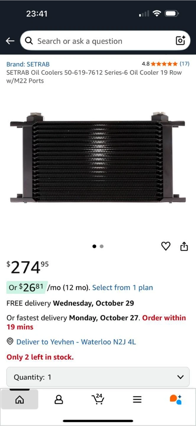 25๐ ๏ธ Setrab Series 6 Oil Cooler โ 19 Row w/ M22 Ports (Model 50-619-7612) Condition: Brand New Price: ๐ฐ $220 CAD โ High-performance 19-row oil cooler for engine, transmission, or power steering applications โ Setrab quality โ trusted by motorsport and racing professionals worldwide โ Series 6 design provides exceptional cooling efficiency in a compact size โ Features M22 female ports for flexible hose and fitting options โ Ideal for custom builds, performance upgrades, and race cars ๐ฆ Brand new, never installed ๐ Pickup in Waterloo, ON ๐ Can be used in many applications โ universal fit (check your setup before purchase)