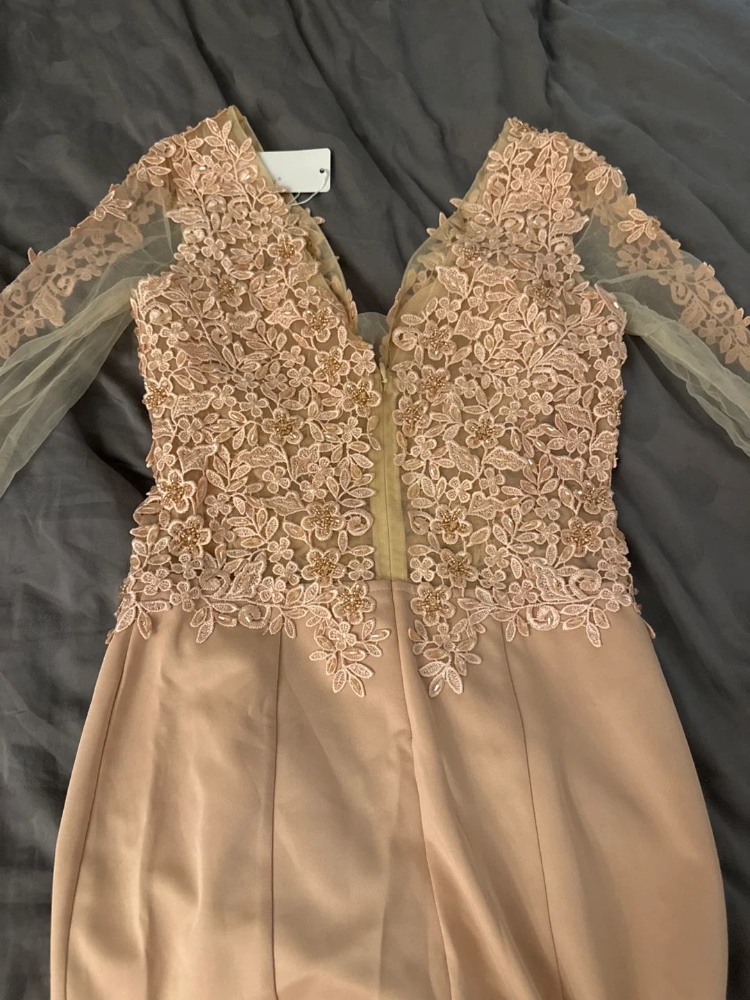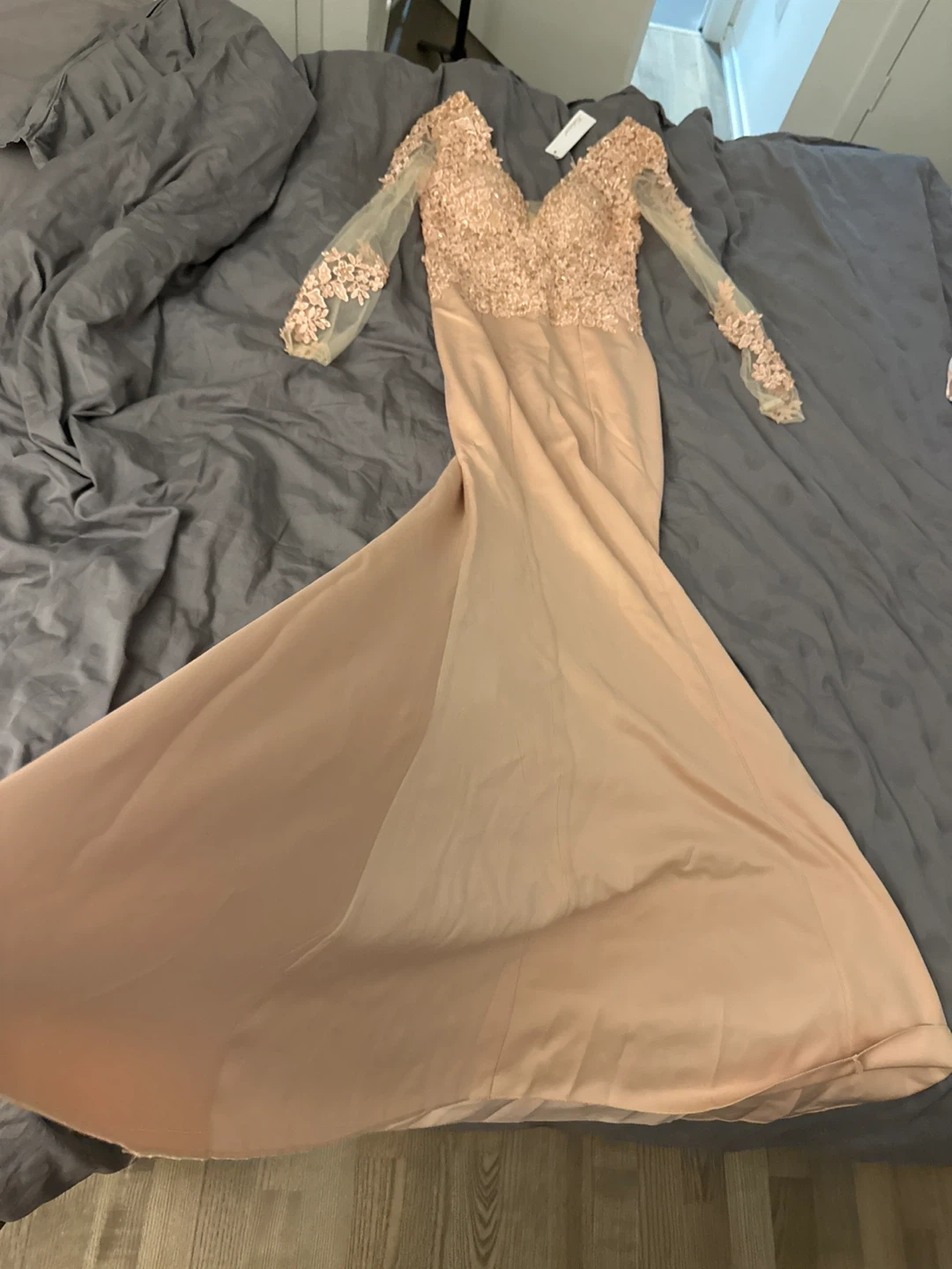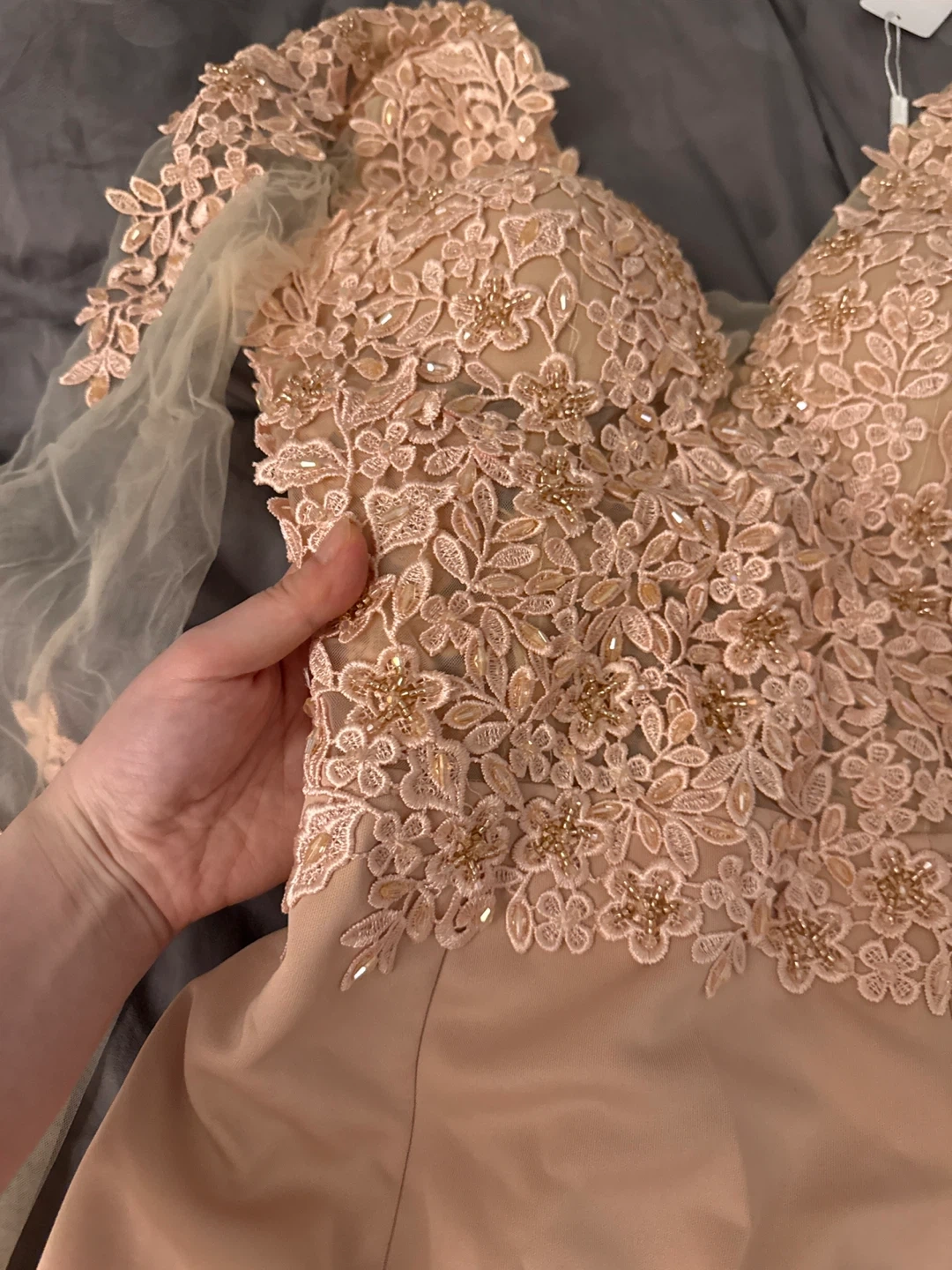 Stunning blush-toned evening dress. It features intricate lace detailing on the bodice and sleeves, with delicate beadwork. The dress has a flattering mermaid silhouette and long, sheer sleeves.