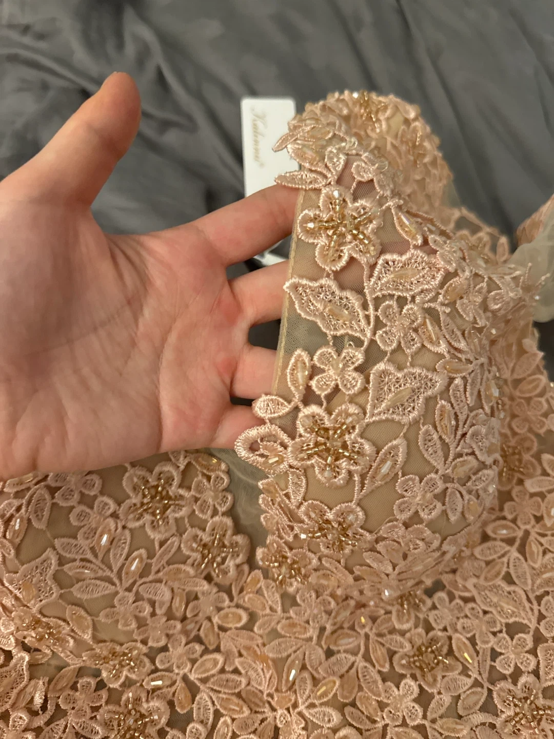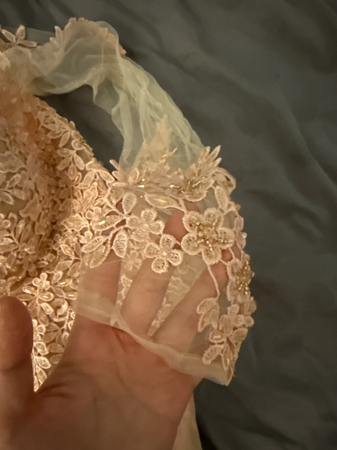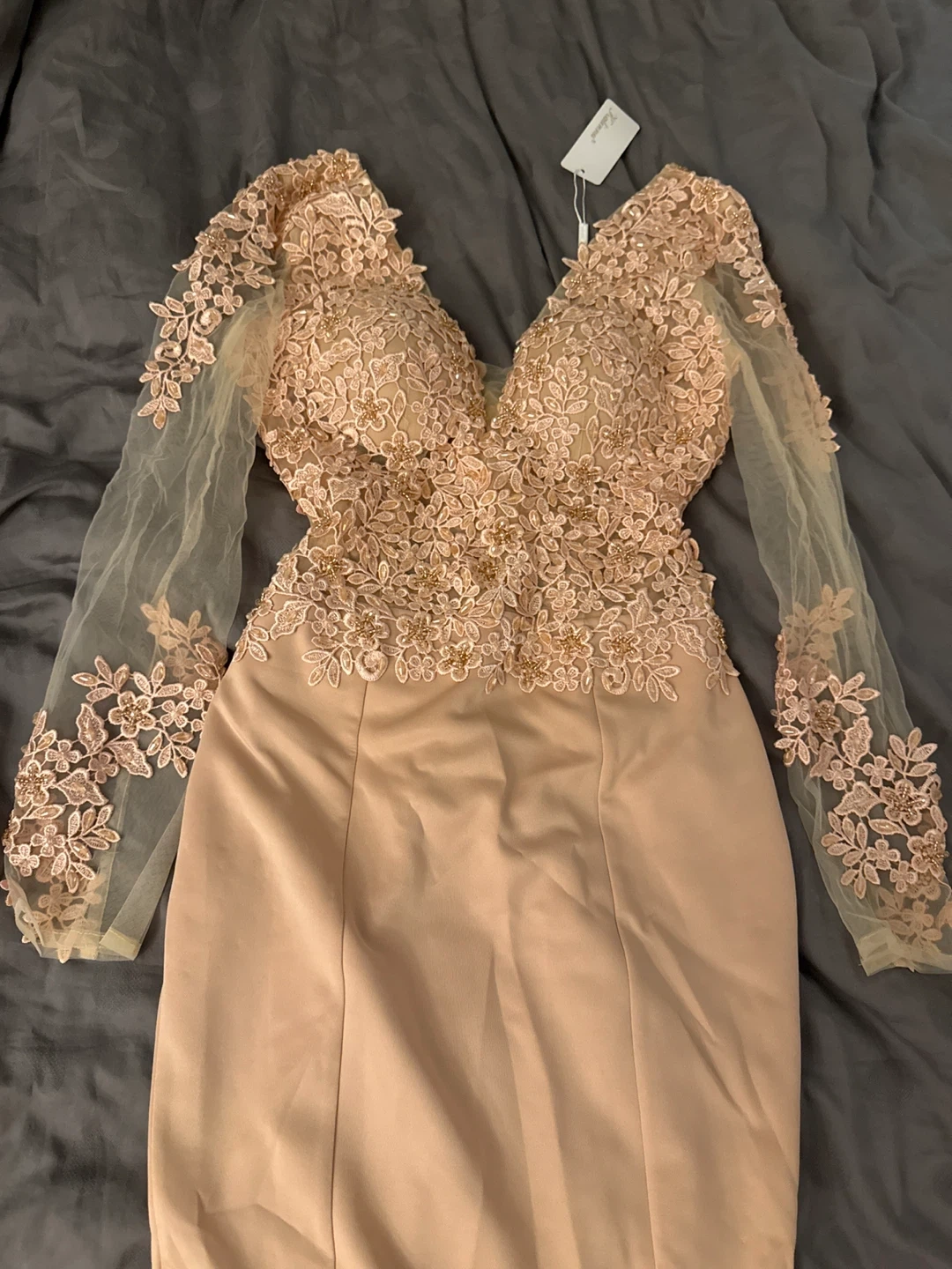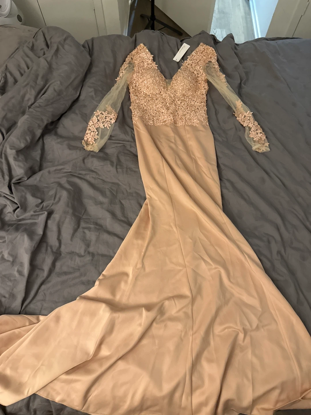 Stunning blush-toned evening dress. It features intricate lace detailing on the bodice and sleeves, with delicate beadwork. The dress has a flattering mermaid silhouette and long, sheer sleeves.