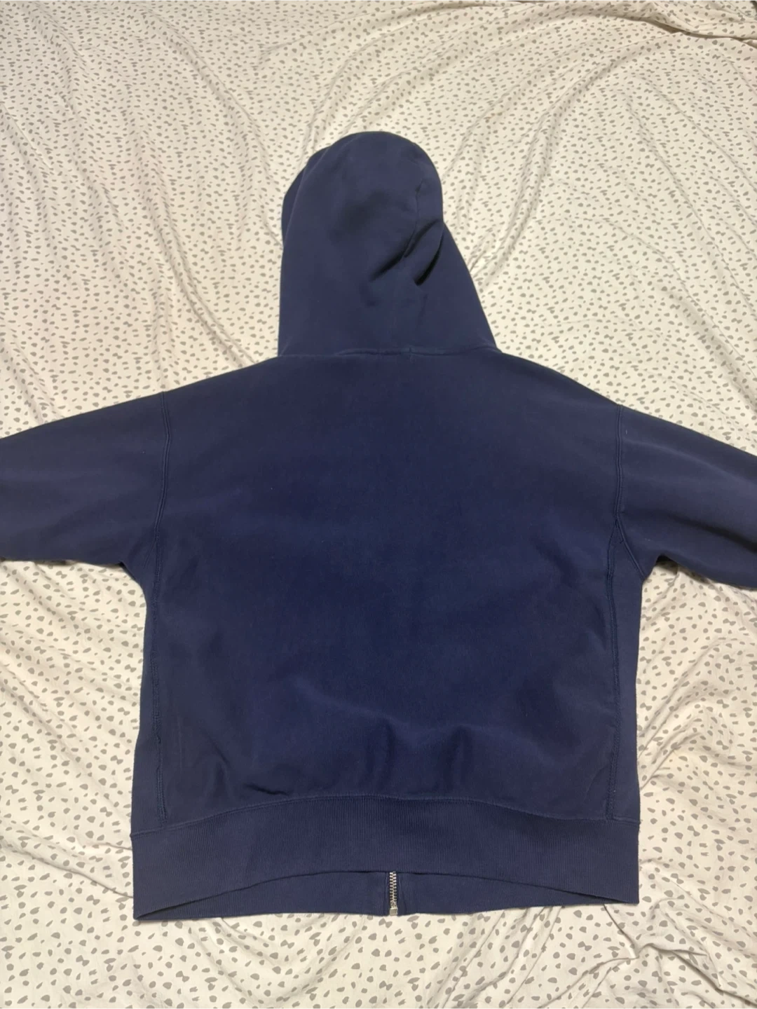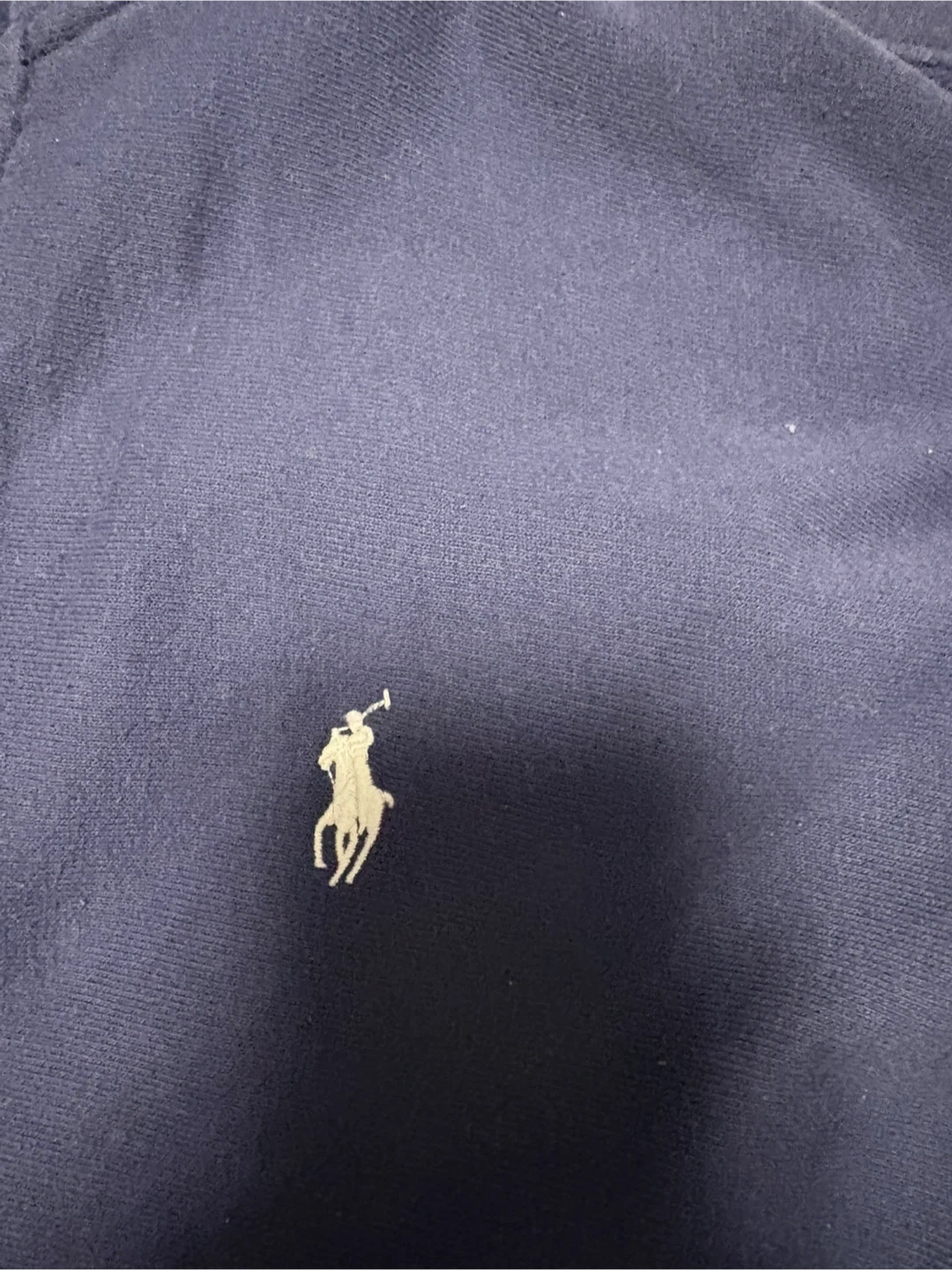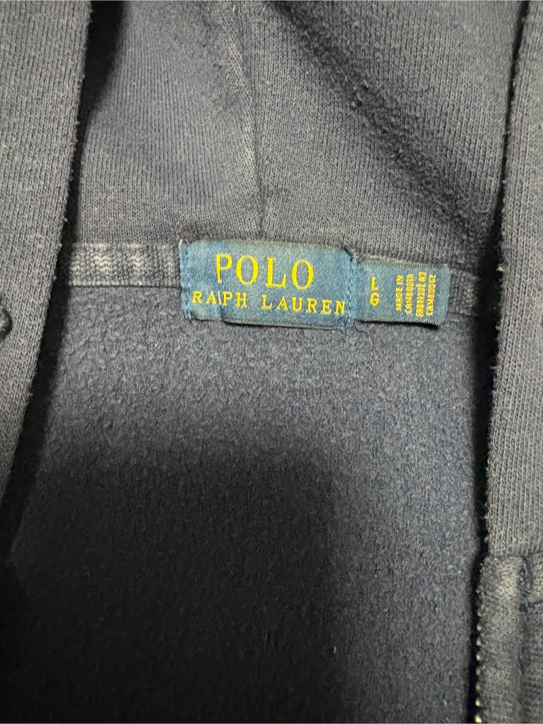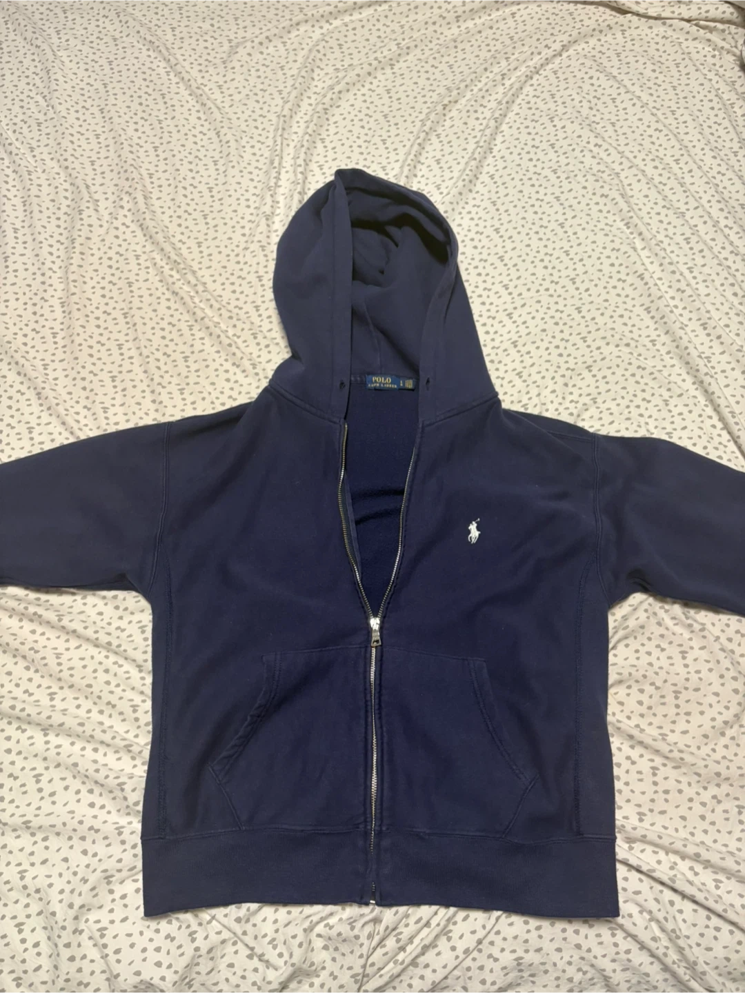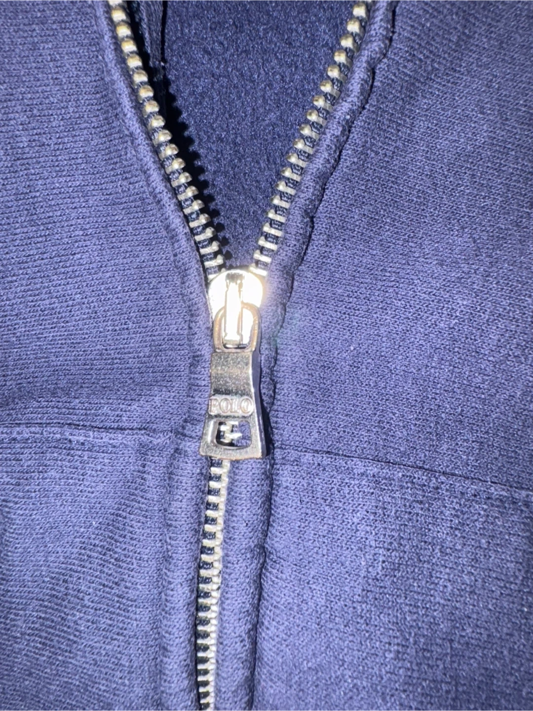 Women’s Navy blue Polo Ralph Lauren zip-up hoodie with the iconic polo player logo. It features a full zip closure and front pockets. Cotton blend material.