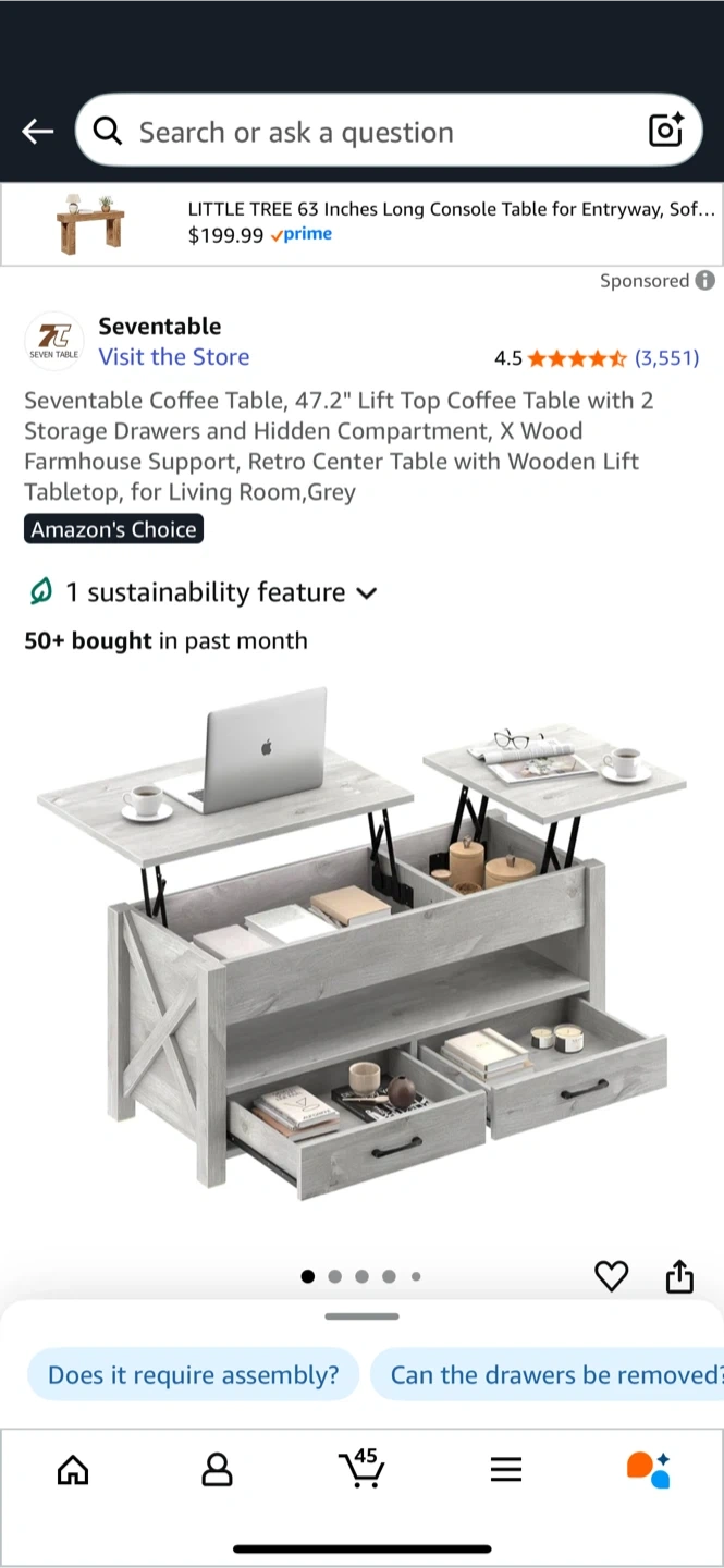 Selling a Seventable coffee table with a lift top! It features two storage drawers and a hidden compartment. The tabletop has a wooden lift, and the table is a lovely grey colour. It's got a farmhouse support and a retro centre table design, perfect for your living room!