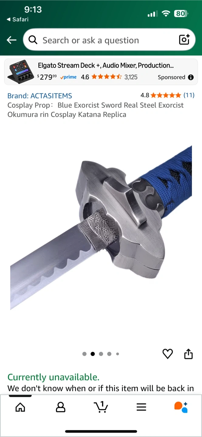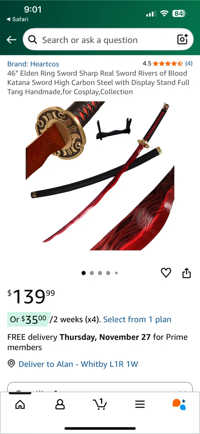10Here is what I have and the quantity 1- 4 x 46" Elden Ring Sword Sharp Real Sword Rivers of Blood Katana Sword High Carbon Steel with Display Stand Full Tang Handmade,for Cosplay,Collection 75 each 5x Cosplay Prop:Katana-Wolf Cosplay Replica Sword Metal Red Blade 75 each 3 x Cosplay Prop:Blue Exorcist Sword Real Steel Exorcist Okumura rin Cosplay Katana Replica 90 each Pick up Whitby