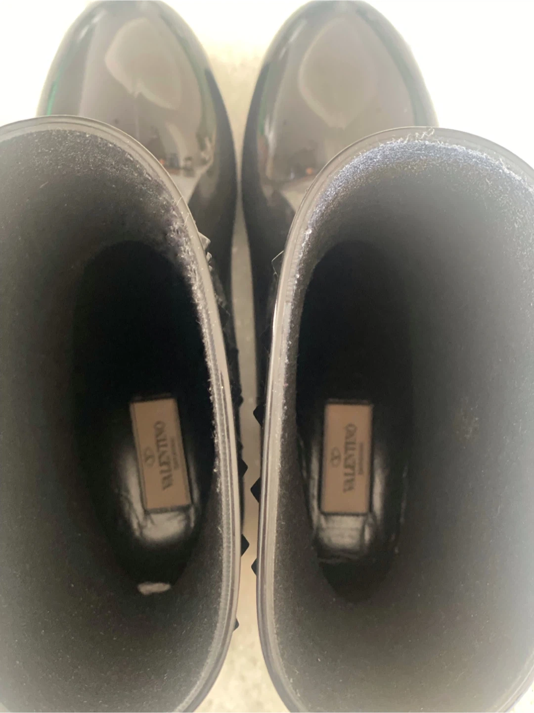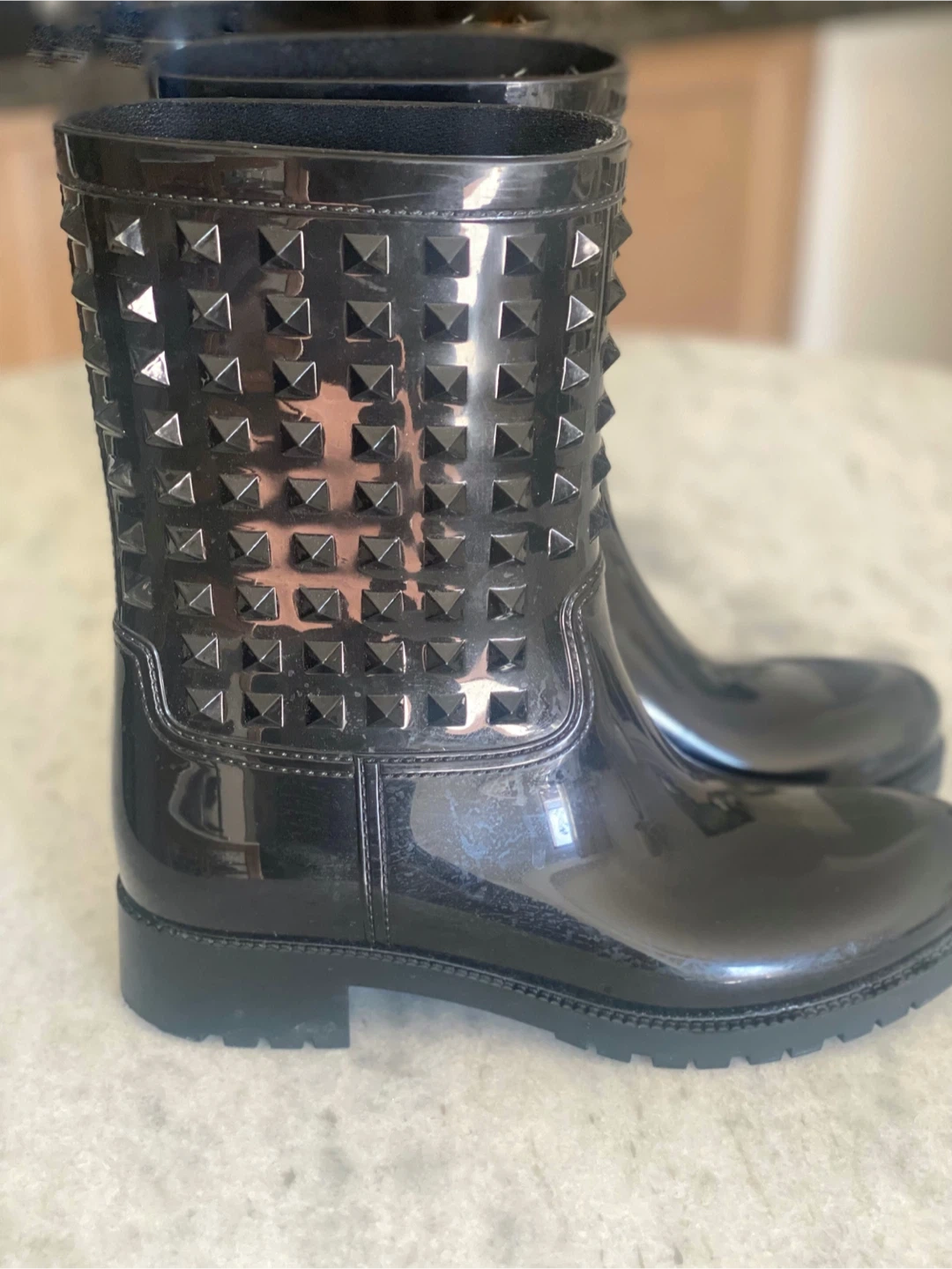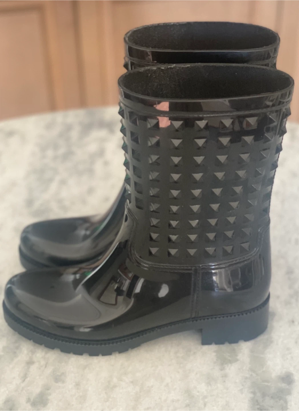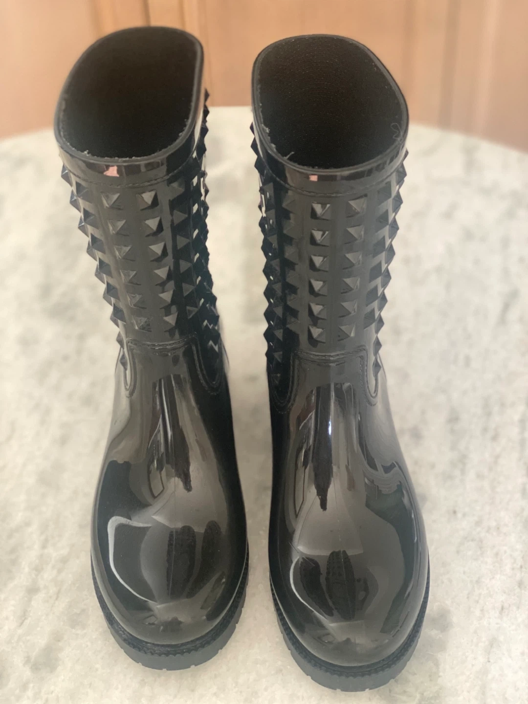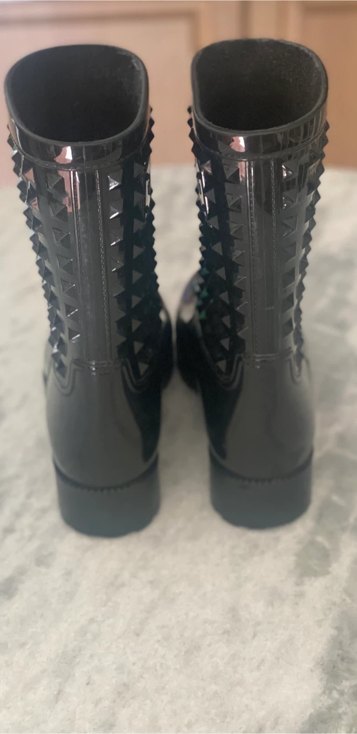 Black rubber rain boots adorned with pyramid studs.