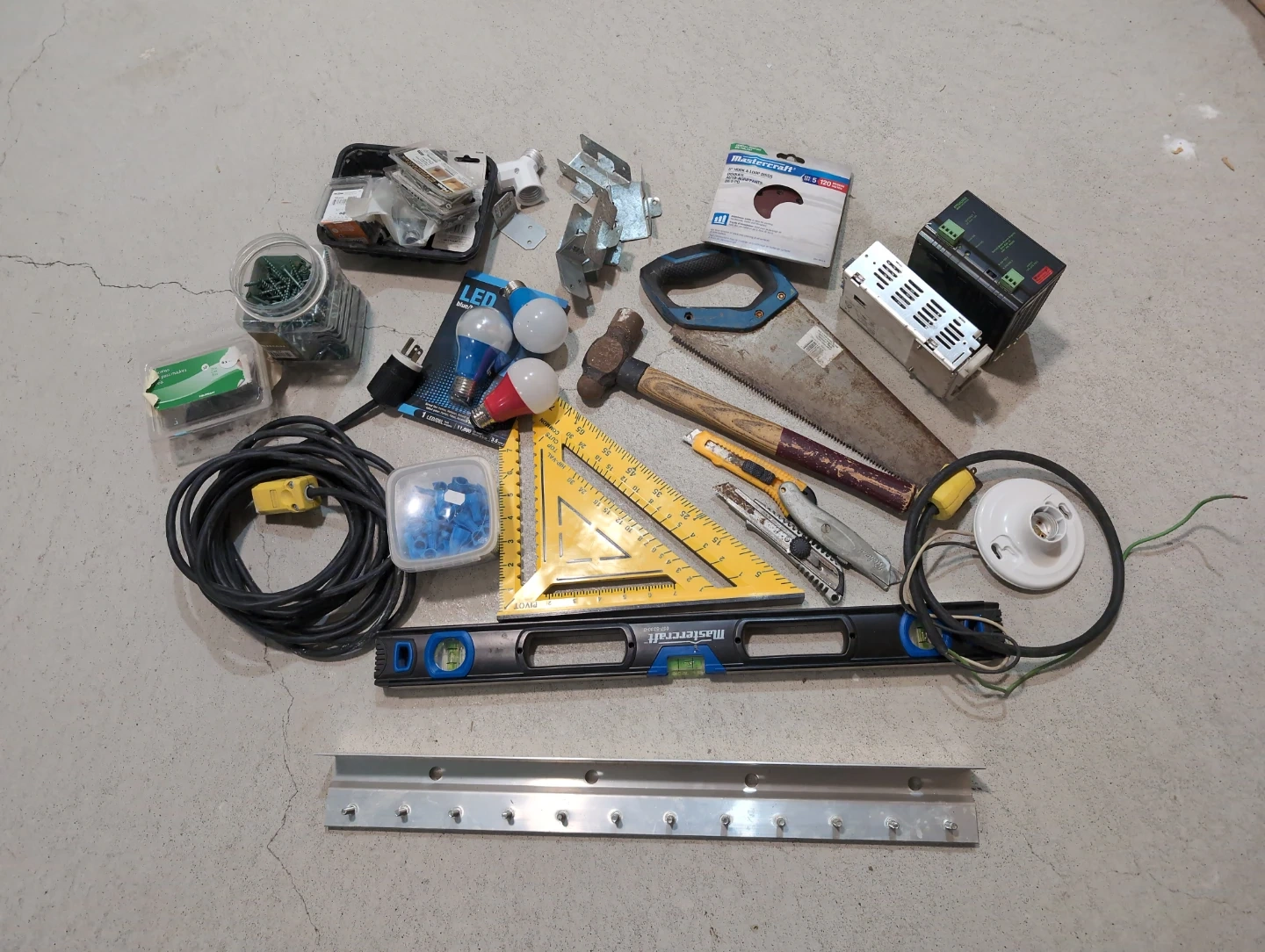 Bundle of assorted tools and hardware including a hand saw, level, measuring tools, light bulbs, and fasteners. Includes a Mastercraft sand disc. Items suitable for various home improvement projects.