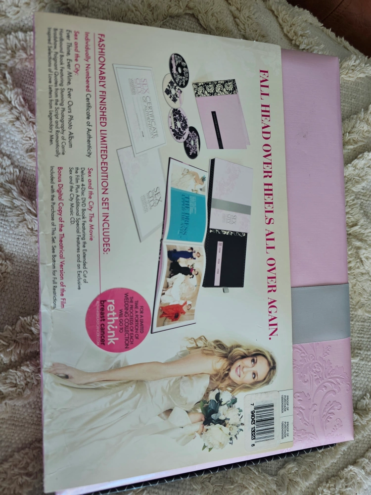 Sex and the City complete series DVD collection in a pink velvet case. Includes a copy of the book *Kiss and Tell*. Limited edition wedding collection also included.
