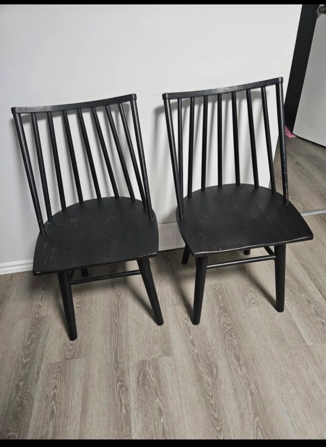 Selling a set of two black side chairs. These chairs have a spindle back design and wooden seats. They're suitable for dining areas or as accent chairs.