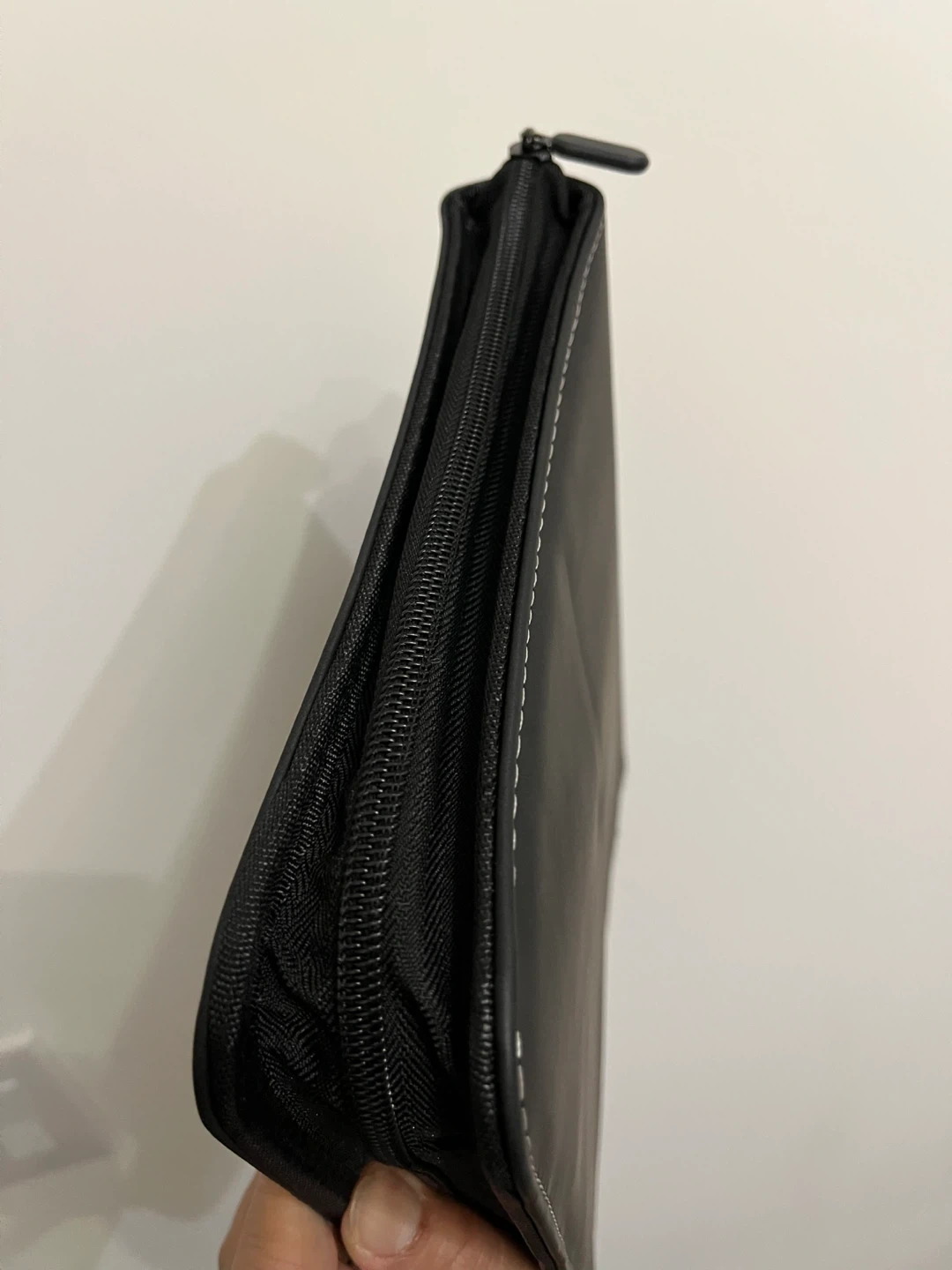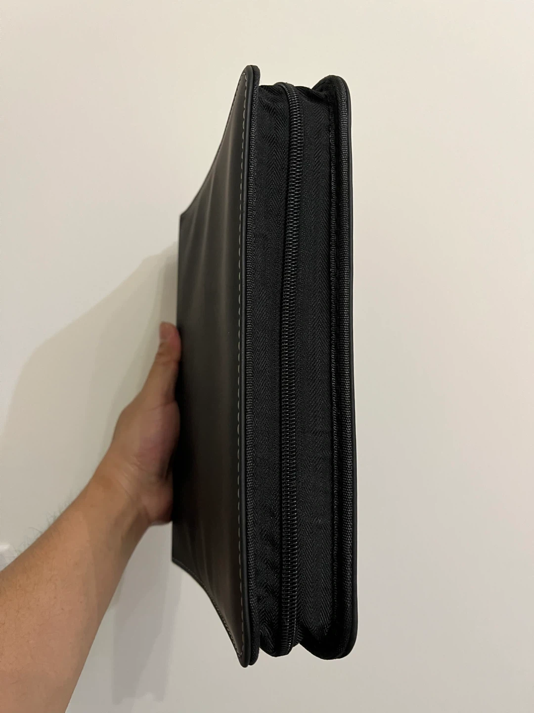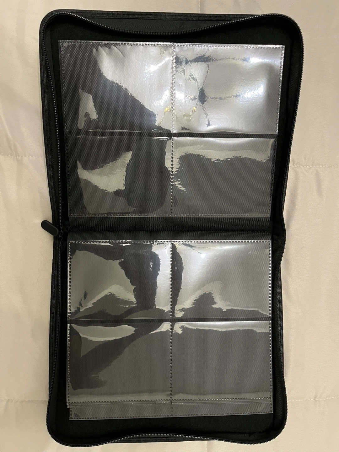 This is a black binder with a zippered closure. It features a sturdy construction and includes multiple clear plastic sleeves inside for organizing items. It's great for storing cards. Top loader fits.
