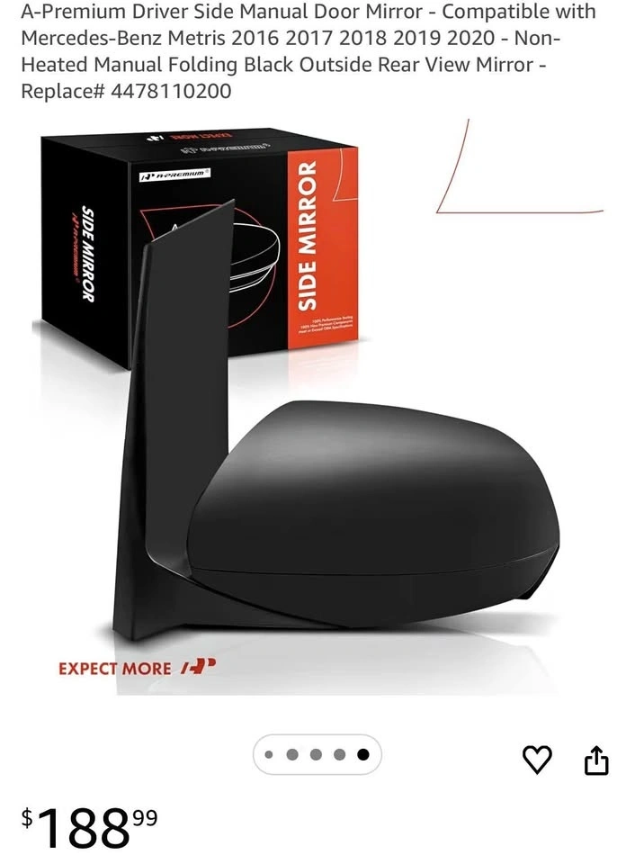 Driver side manual door mirror for Mercedes-Benz Metris 2016-2020. Non-heated, manual folding, black outside rear view mirror. Replaces part number [hidden information]. Pick up only.