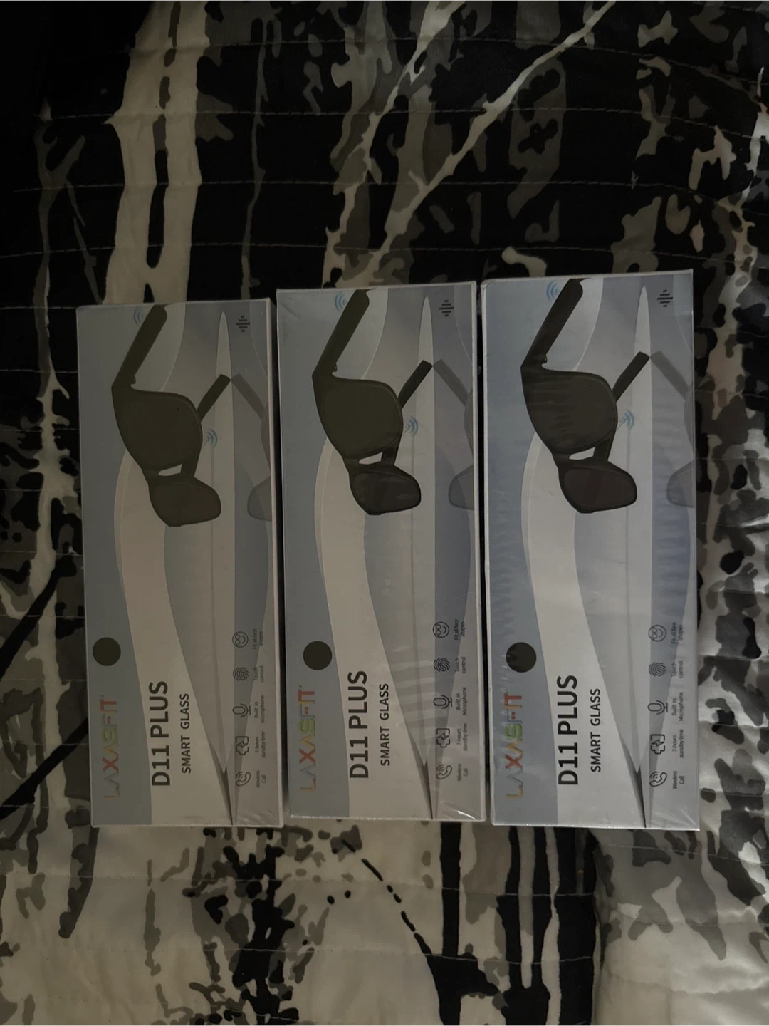 Brand new LAXASFIT D11 PLUS smart glasses, sold as a 3-pack. These glasses offer hands-free calls and microphone functionality. They boast a 7-hour standby time and touch control operation. Features include button shapes for interaction.