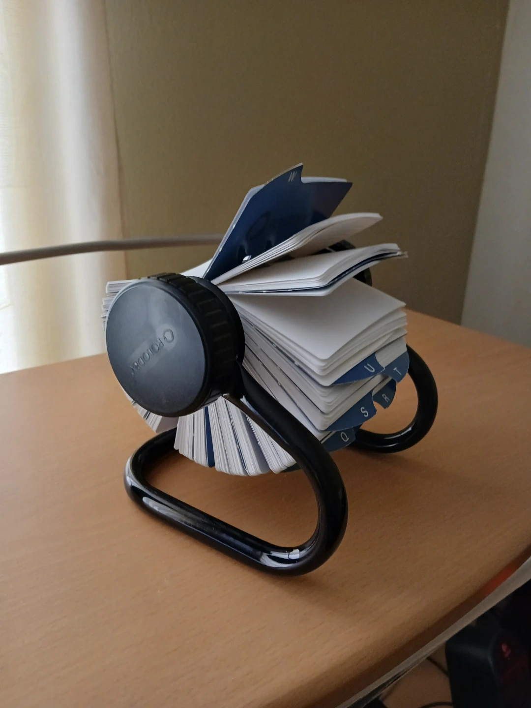 This is a white rotary card file holder. It's designed for organizing business cards or contact information. The holder has tabs with letters for easy sorting.