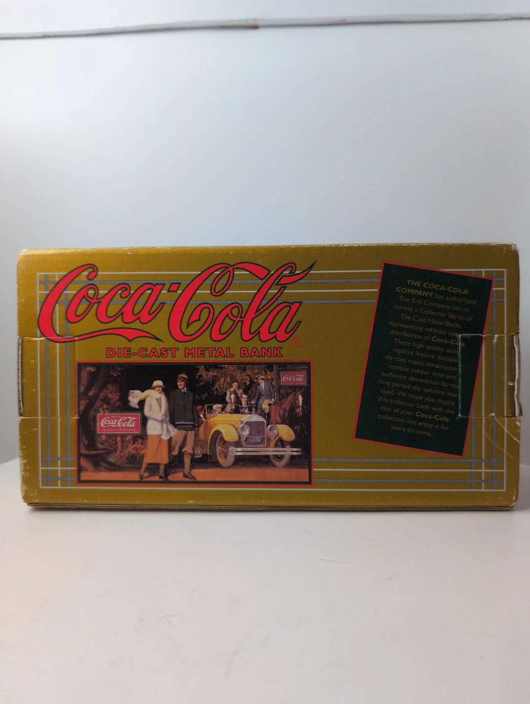 This is a Coca-Cola die-cast metal bank truck, produced by The Ertl Company, Inc. It features durable die-cast metal construction with classic rubber tires and authentic detailing. The truck is designed to represent a vehicle from the time period of Coca-Cola's history.