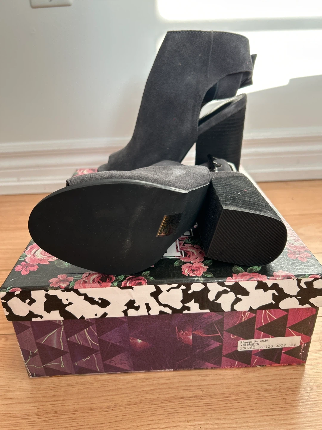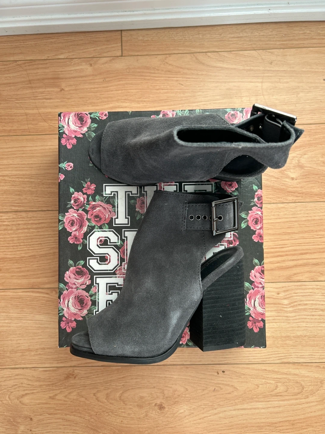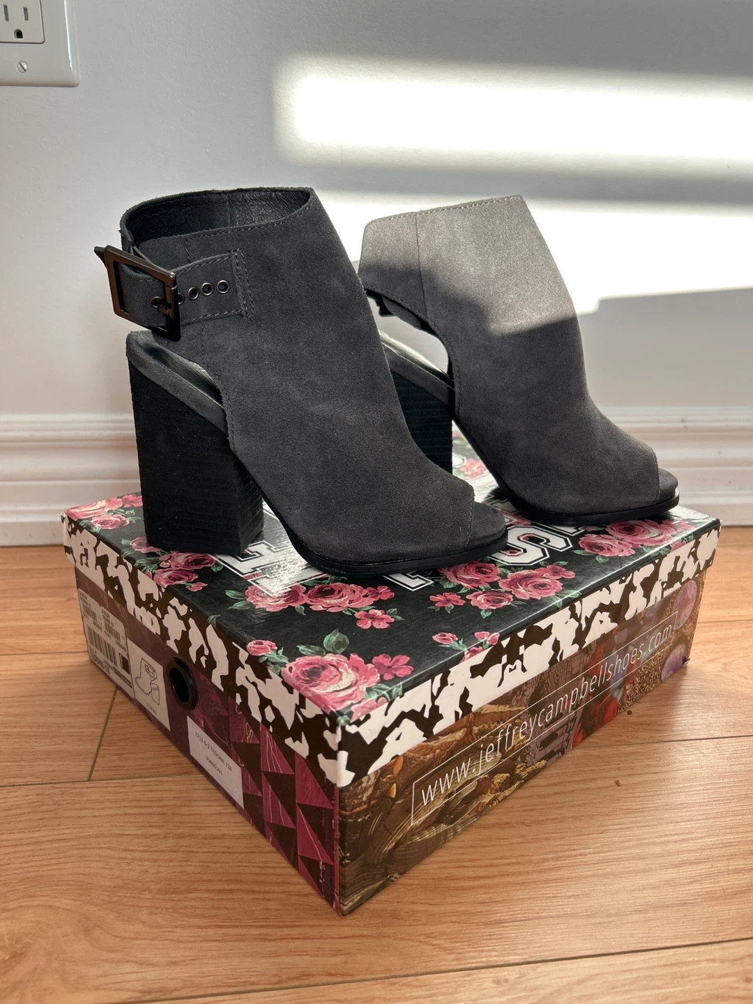 These are a pair of brand new Jeffrey Campbell Tedone open-toe booties in a lovely gray suede! They feature a chunky heel and a stylish buckle detail. The size is 6. Comes with the original box!