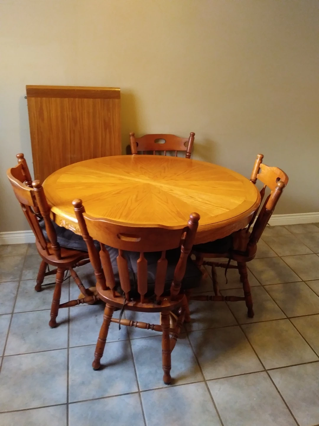 This is a four-piece wooden dining set, featuring a round table and four matching chairs. The wood has a warm, natural finish. It's perfect for smaller dining spaces or breakfast nooks. Chairs are made of solid wood with spindle backs.