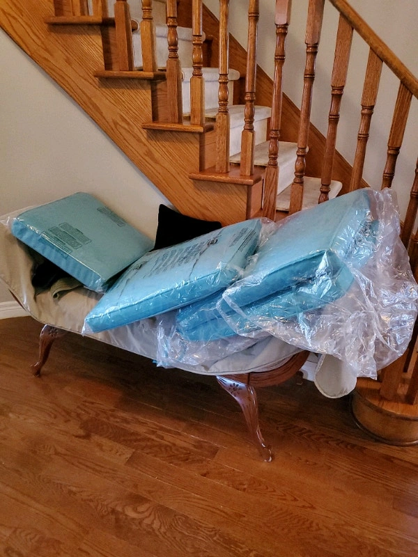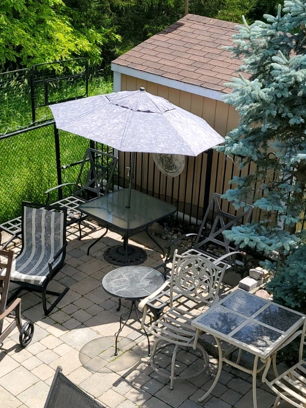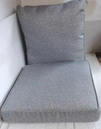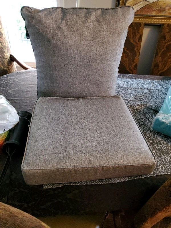 High-quality outdoor cushions and a market umbrella available. We have pillow back cushions and seat cushions in various colors including gray, black, beige, cast silver, red/burgundy, striped black/white, and navy. Some seat cushions have attached back pillows. Made for comfort and durability, they are water repellent and UV treated, fade-resistant, and made with 100% polyester fill. Pillow dimensions are approximately 24x22 inches, and seat cushions are around 24x23x5 inches. We also have a gray set measuring 19x19x3 inches. Additionally, there are new Sunbrella replacement chair cushions available in various sizes and colors (beige, teal, black/white) with UV-resistant, stain, fade, water, mold, and mildew-resistant fabric. Some sets include a seat and back cushion. A new grey 7.5-foot English garden market umbrella is also available. Please inquire about specific colors and quantities.