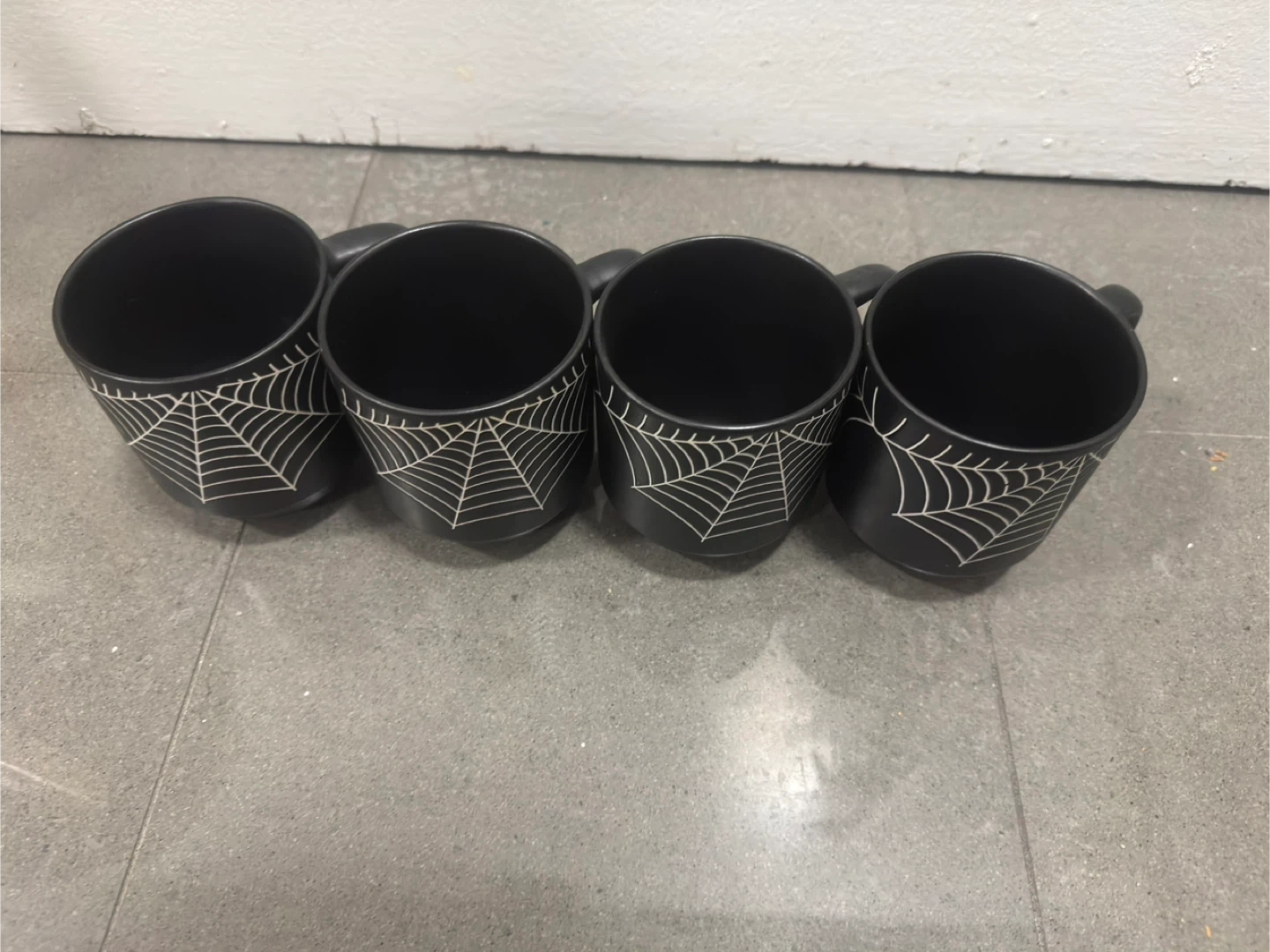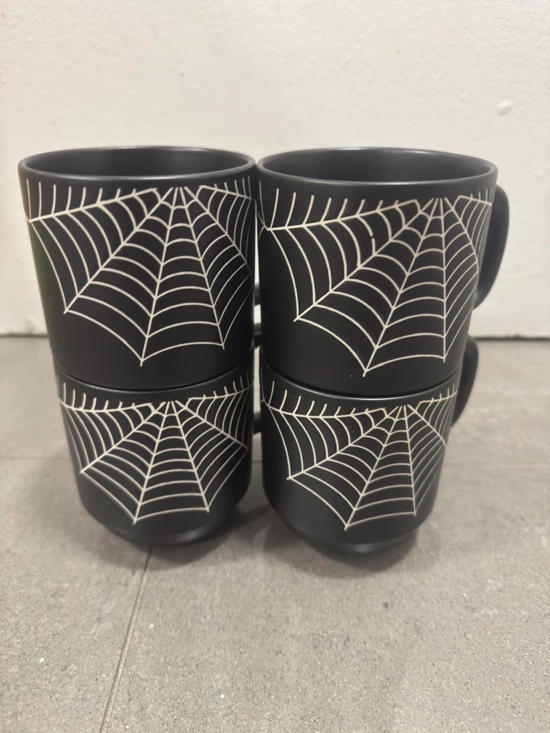 Selling a set of 4 Spiderwebs stackable glazed mugs. Perfect for Halloween or for some unique home decor. They are in like-new condition.
